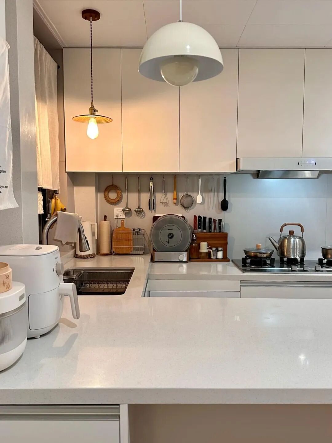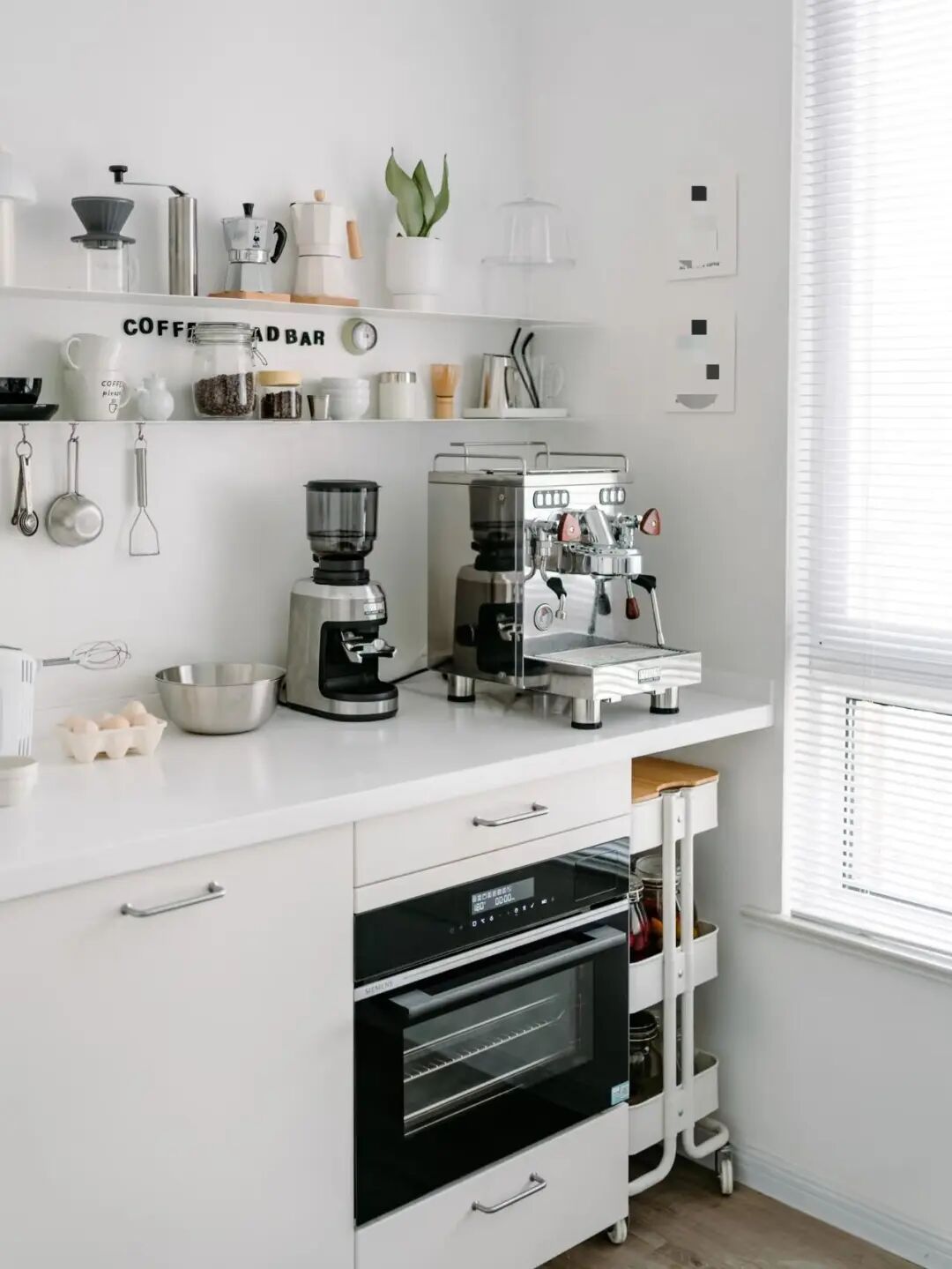 洞洞板或挂杆墙:展示常用工具(打蛋器、刮刀),既是收纳也是装饰。