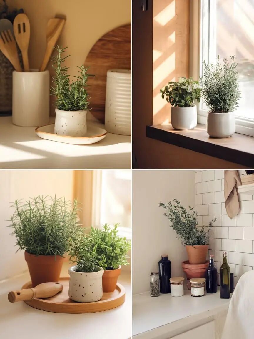 窗边摆香草盆栽,比如:迷迭香、薄荷,随取随用;墙面挂复古食谱画框或温度计,实用又温馨。