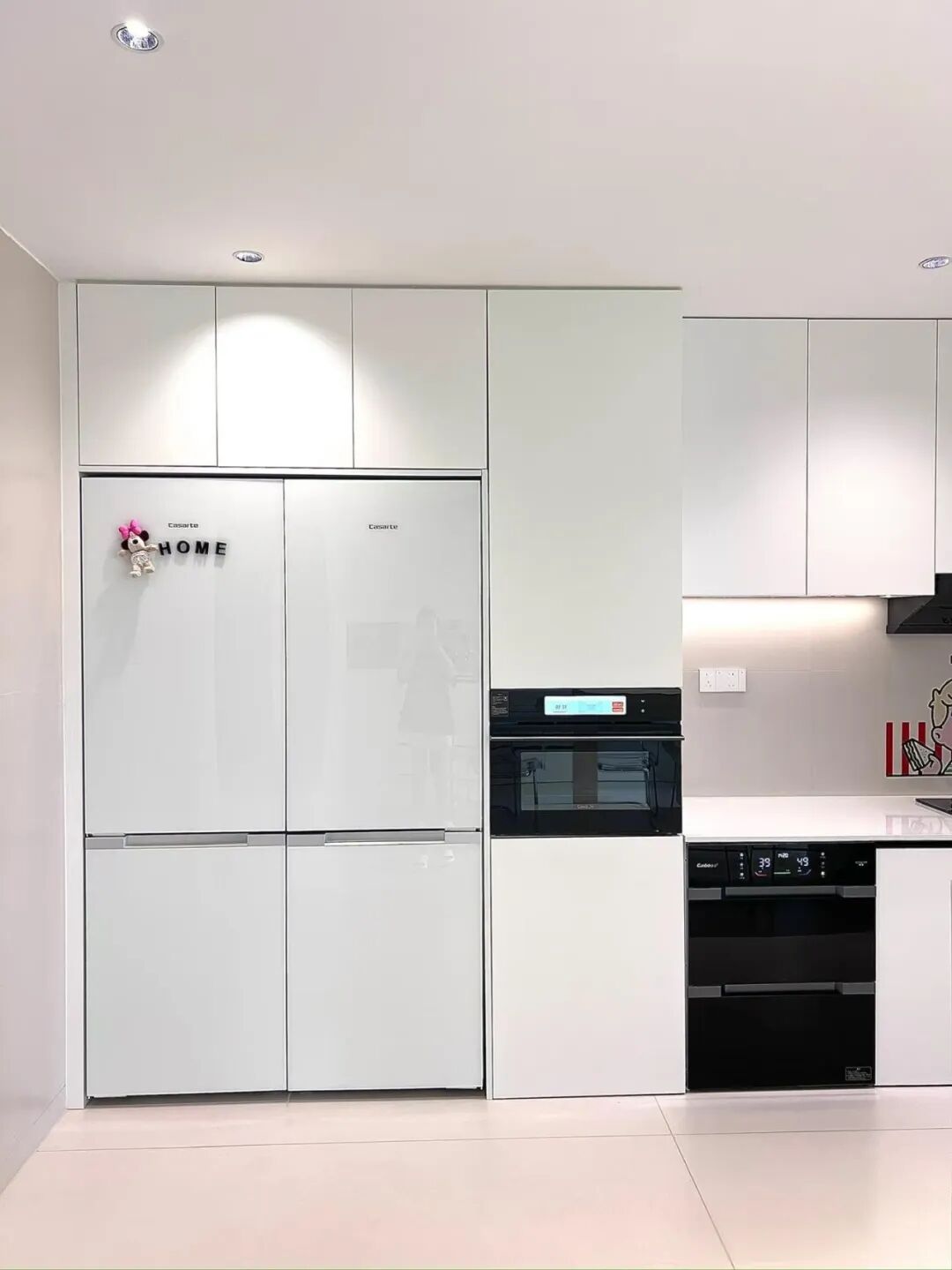 重点照明:吊柜下安装灯带,切菜不背光;烤箱区增设定向射灯,观察食物状态更清晰。