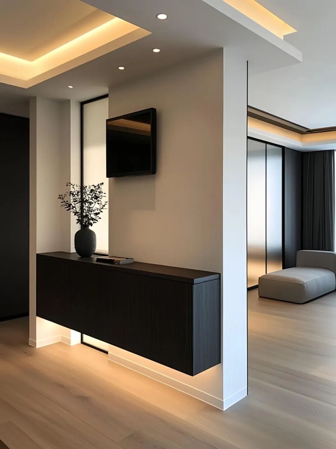 墙面巧用镜面元素,在走廊尽头、光线死角或狭窄墙面上,嵌入镜面、不锈钢条或亮光金属装饰,能有效拓展空间感并反射光线。