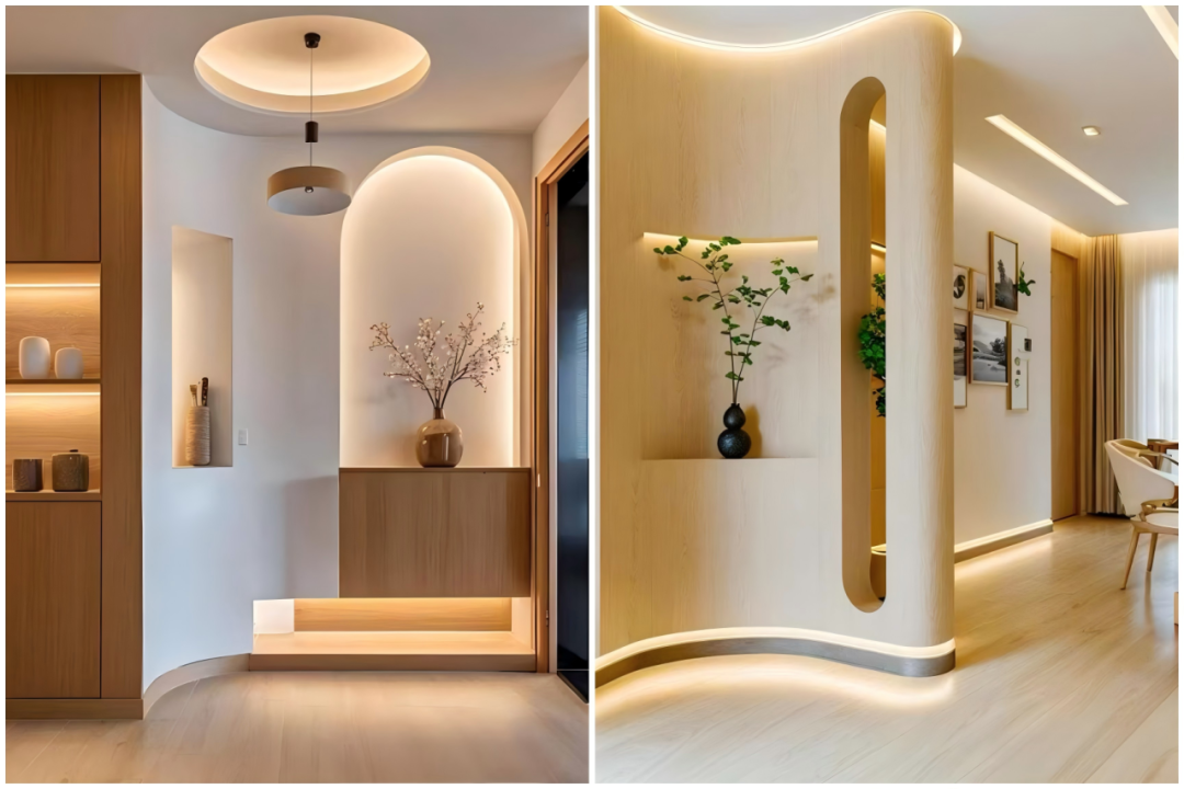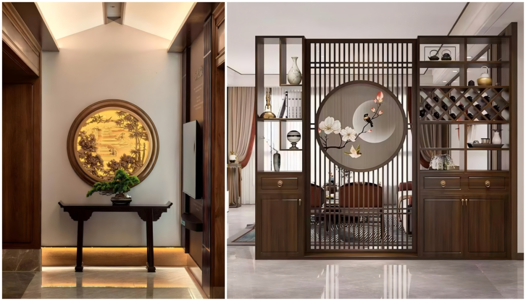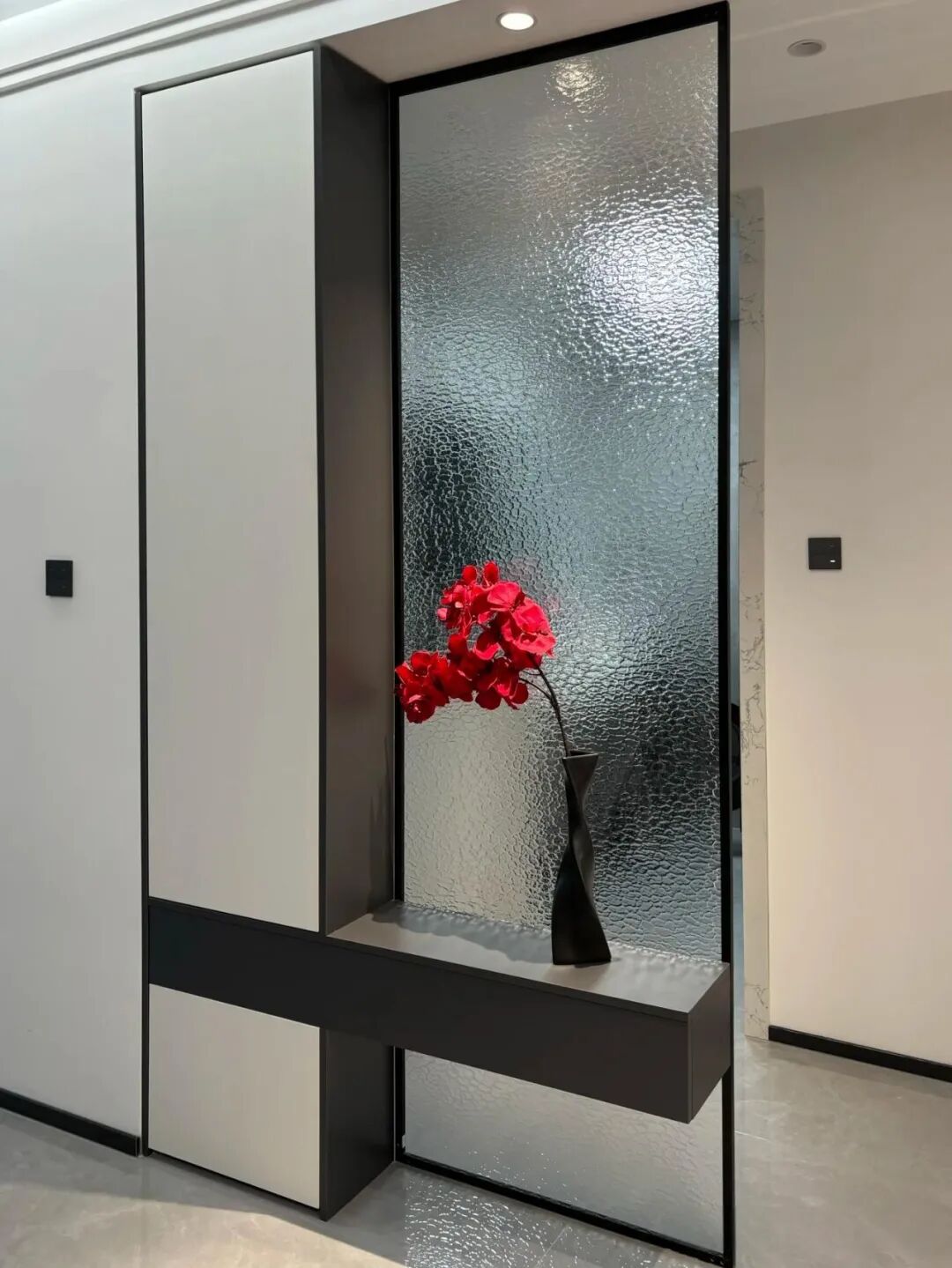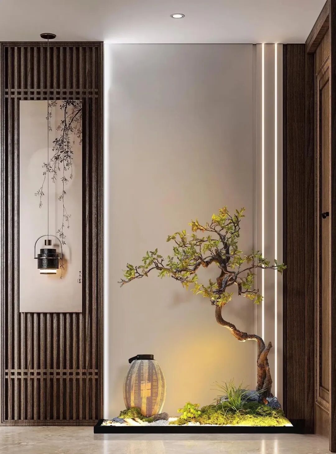 玄关尽头留一处“视觉焦点”:枯山水造景、复古花屏或悬浮展示柜,瞬间提升格调。