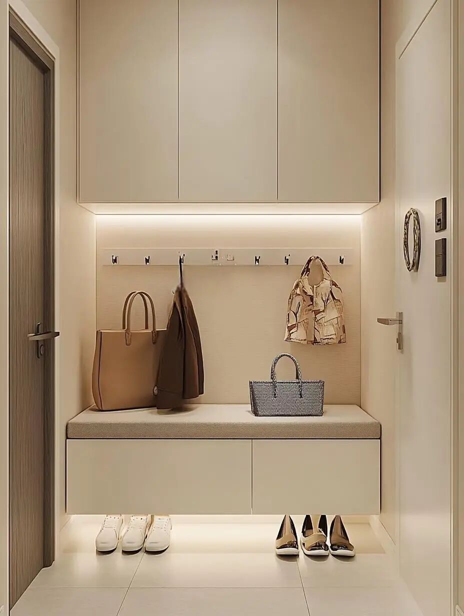 通顶柜体整合鞋柜、换鞋凳与置物台,柜门采用无拉手设计或隐形反弹器,立面干净利落。