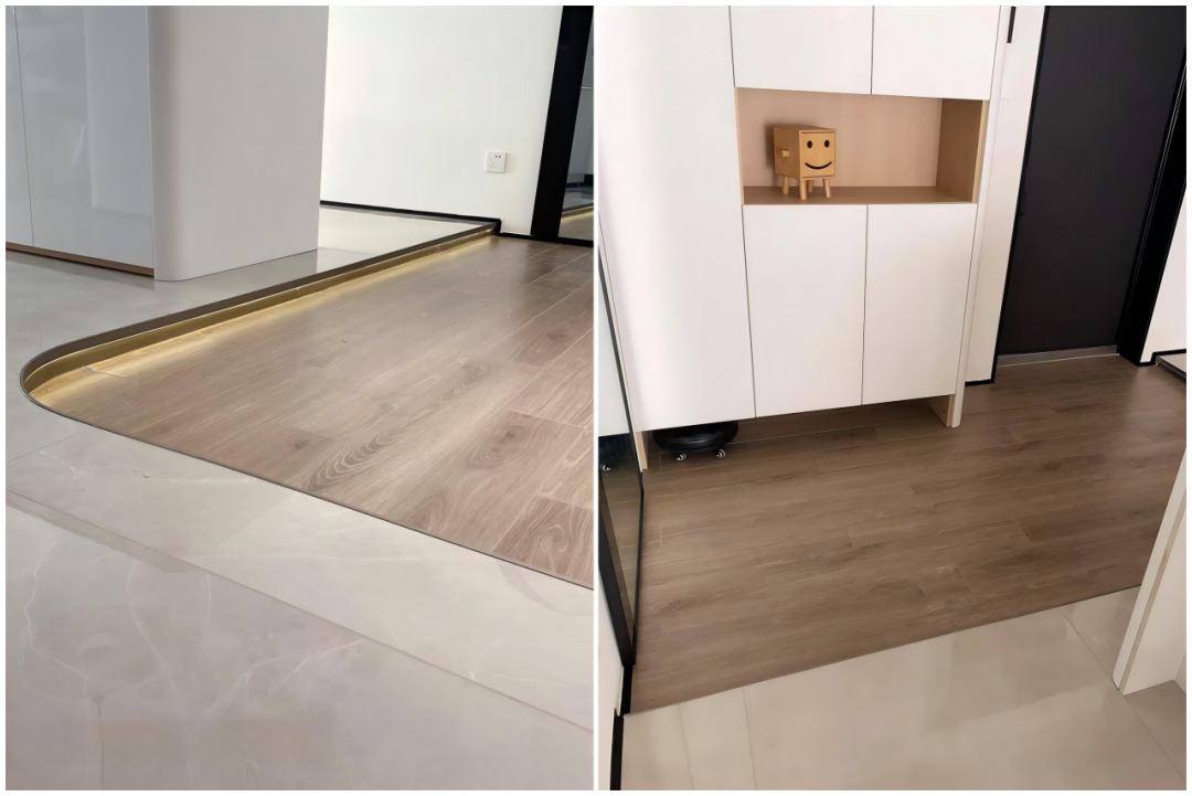 玄关区域下沉3.5cm,搭配釉面瓷砖或木纹砖,巧妙区分室内外,阻隔灰尘。下沉区嵌入线性灯带,回家时自动亮起,不仅实用,更让每一步都充满归家的仪式感。
