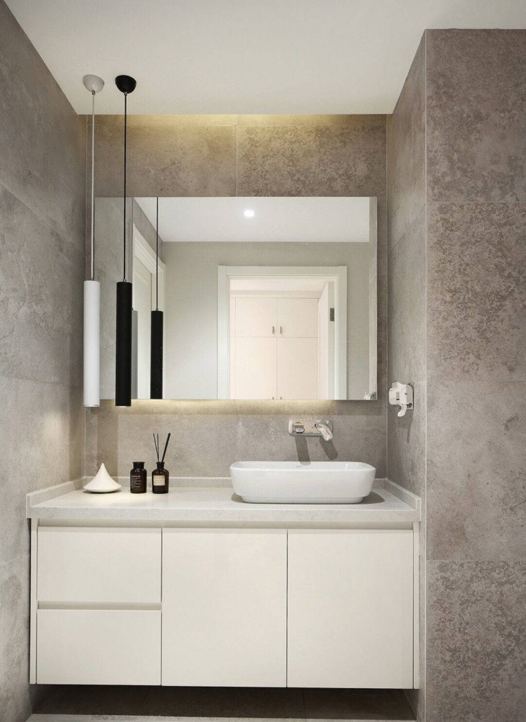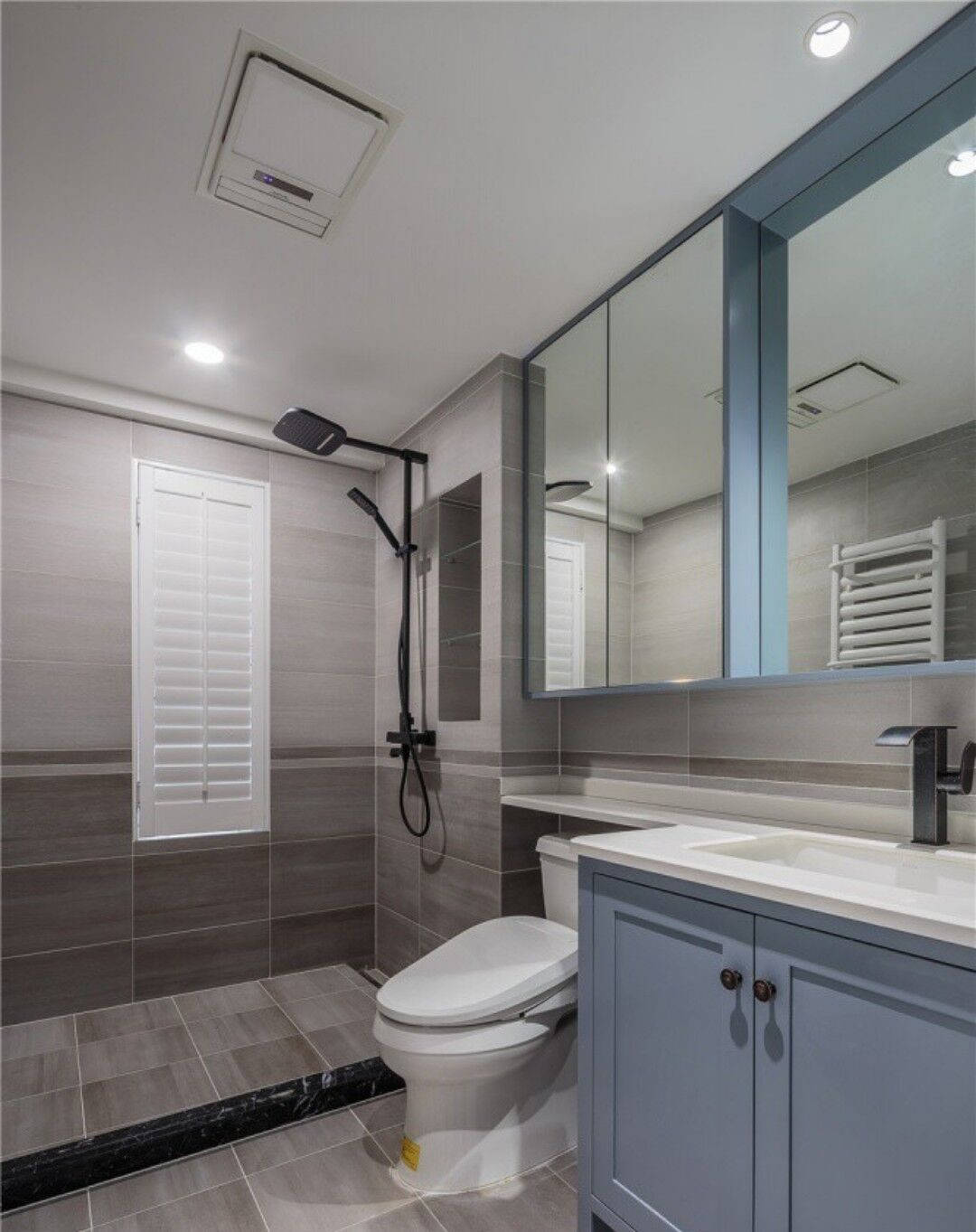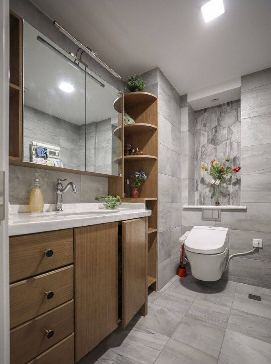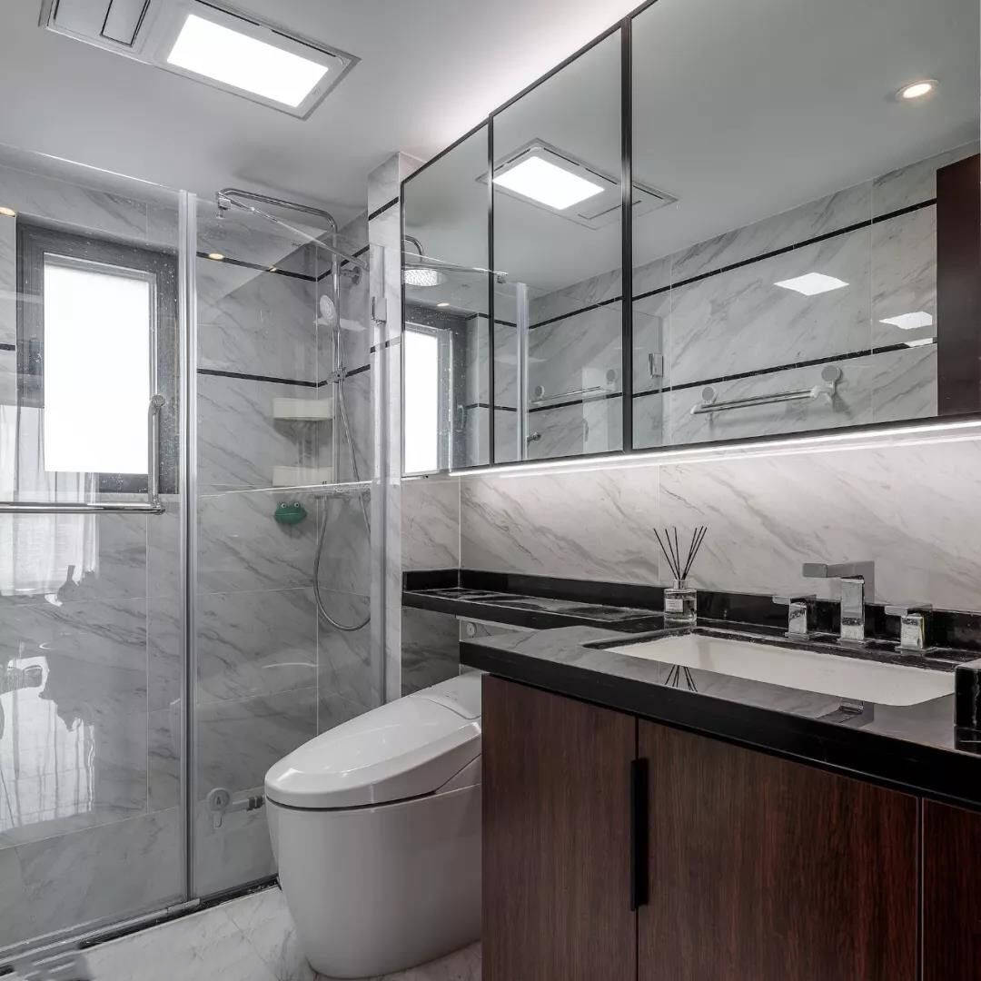 还可以在马桶水箱上方安装一个延伸的台面,将手盆台面做出一个转角直接改在水箱上面,镜面柜也做延伸设计,将马桶上方空间利用到了极致。收纳力自然不容小觑!