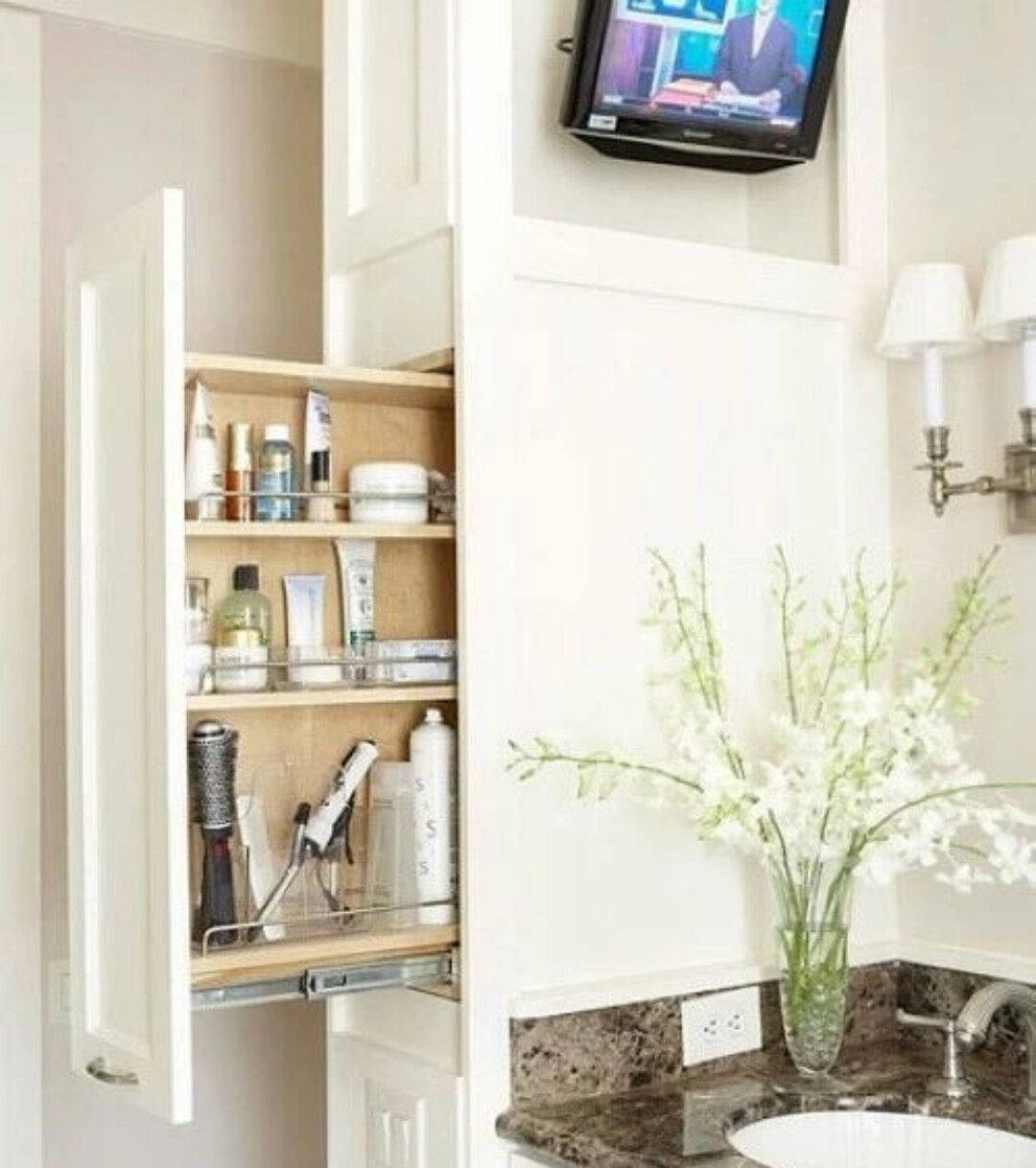 如果手盆旁边是管道,那么可以利用包管在手盆旁边做壁龛收纳格,左右一伸手就能拿到洗漱用品,一点都不麻烦。