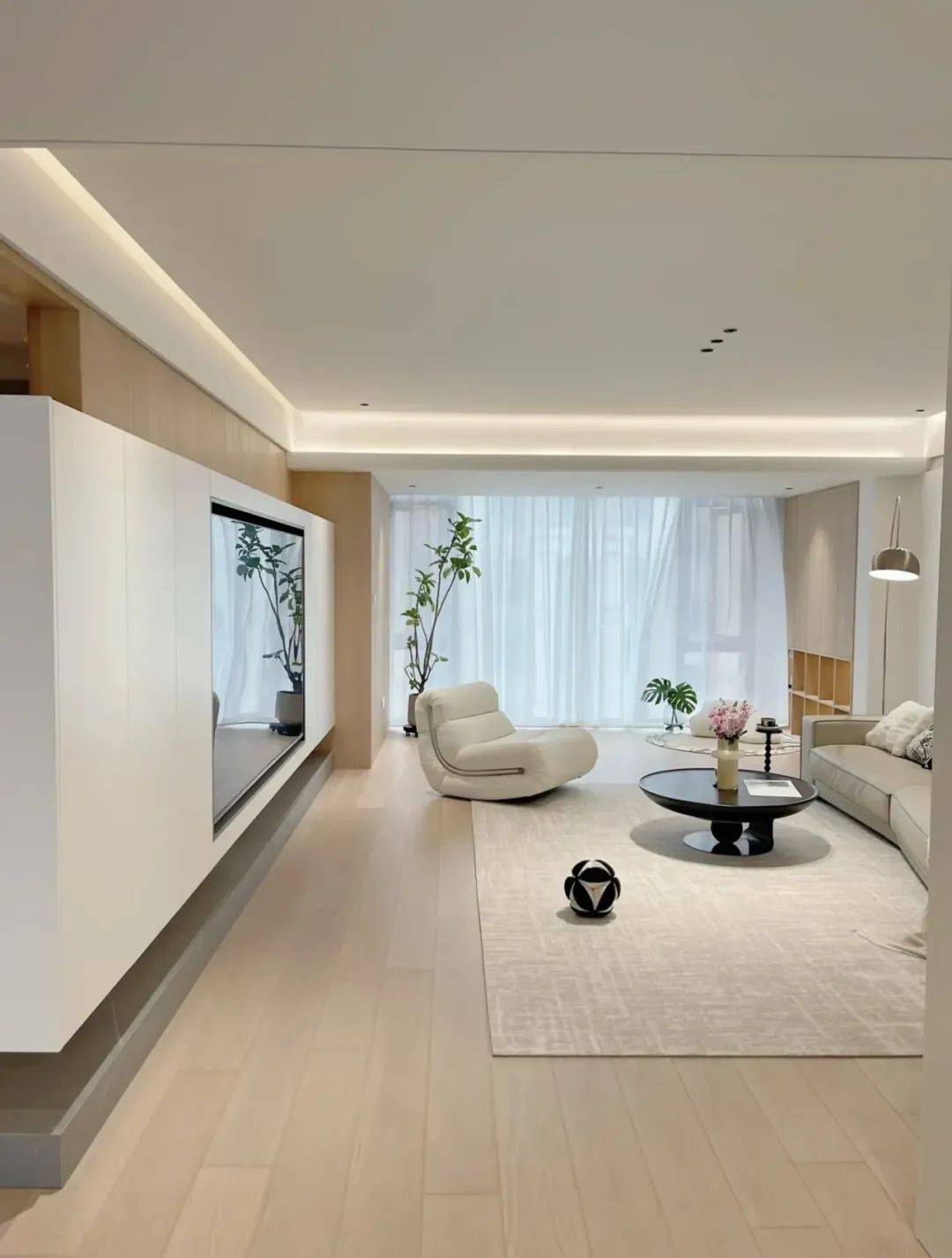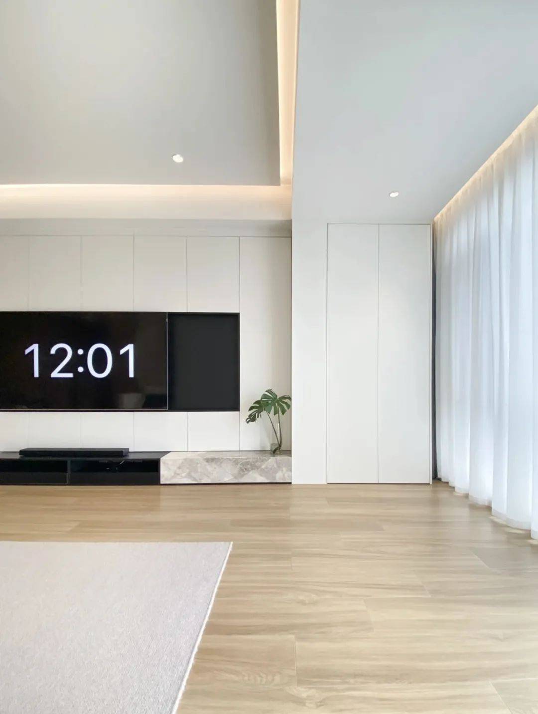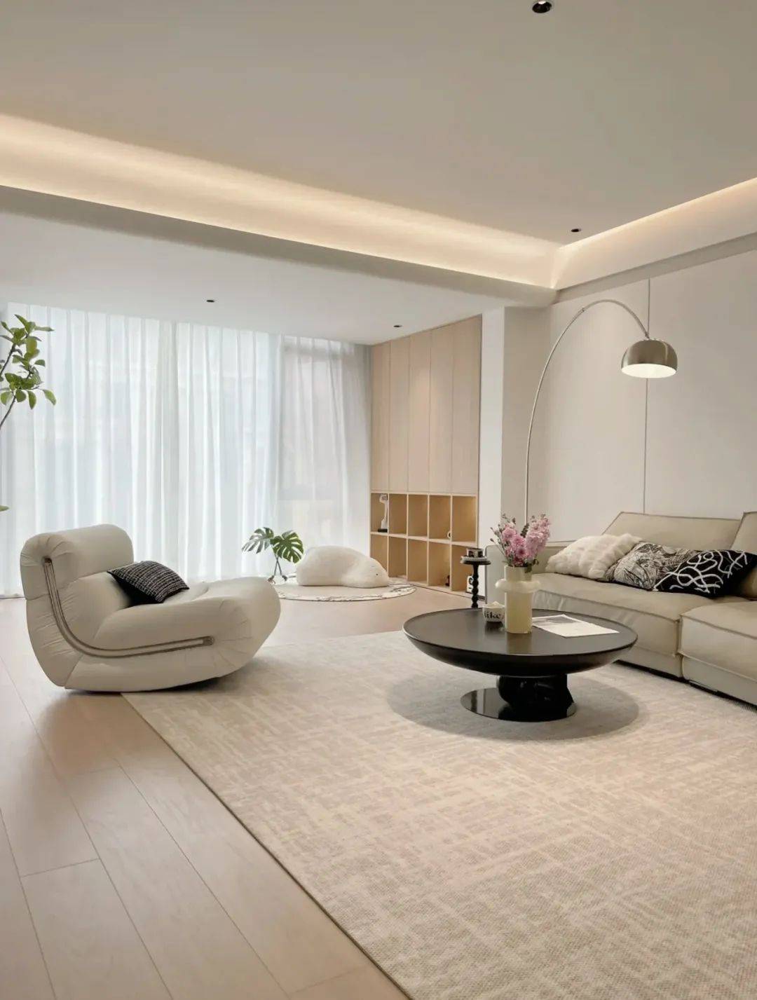 如果再给悬浮吊顶,加上灯带,那除了弱化顶梁以外,还能让客厅更有氛围,更有呼吸感。