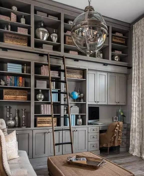 如果你很爱看书,在原来放电视的墙面打造一面顶天立地的书架或者书柜,甚至打造一面爬梯书墙。