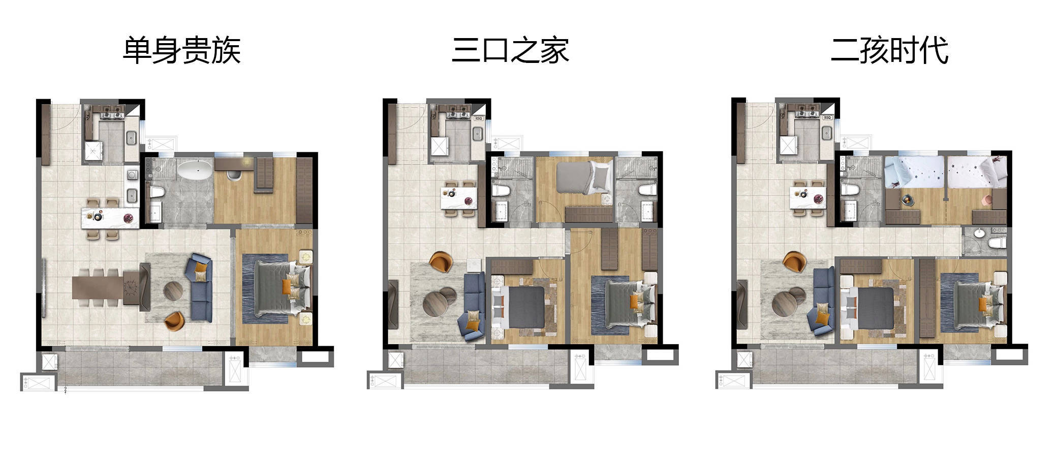 这个户型也是全生命周期可变,我放的户型装修图:单身,三口之家和二孩时代。