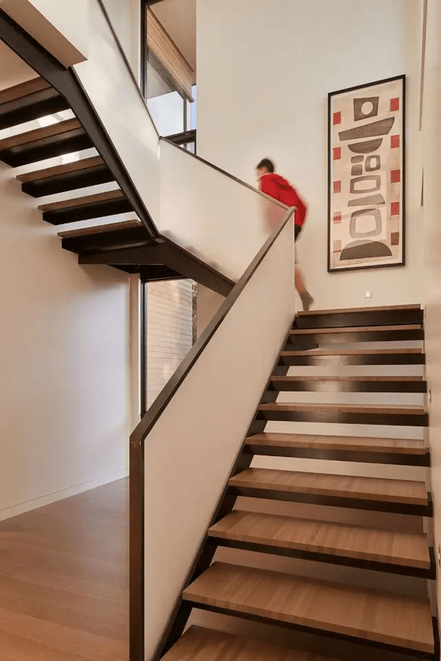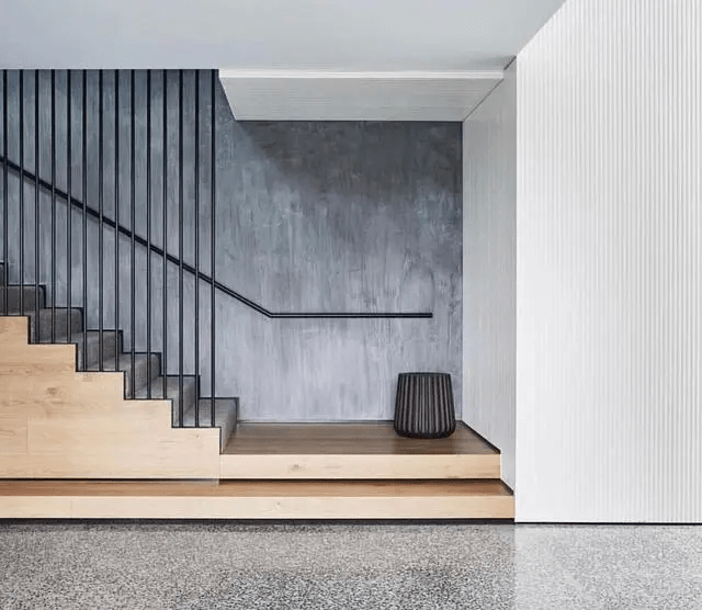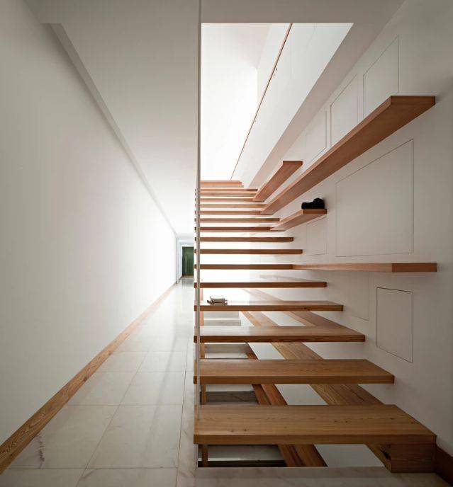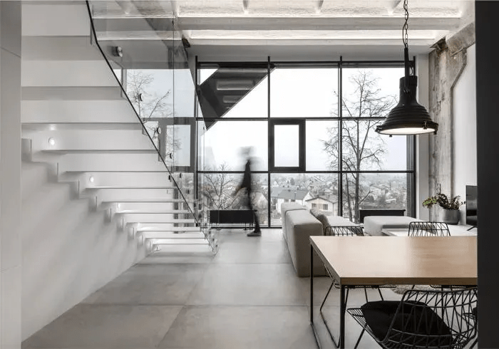 一般直梯多应用于工业风格,简约大气。相比其他造型各异的楼梯,直梯的安全性更高,但是一般直梯都是靠墙设计,所以占用的空间也比较大,如果你家面积不是很大不建议采用这种楼梯设计方式。