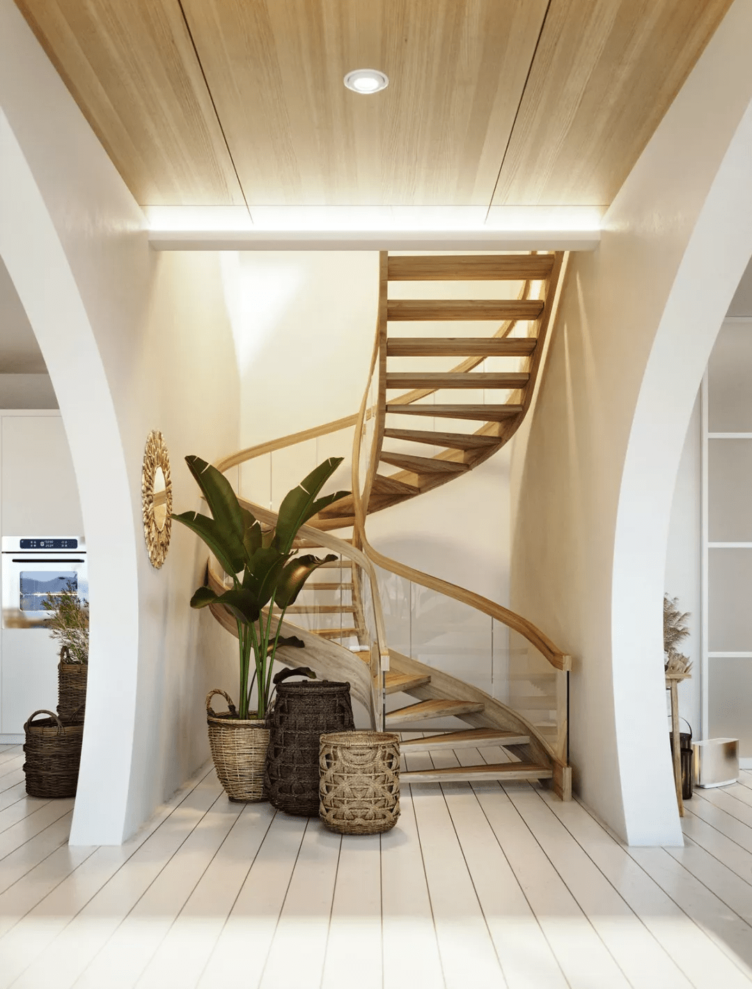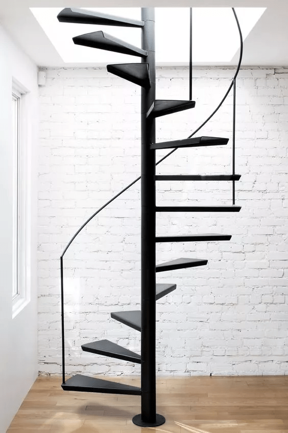 旋转楼梯不需要依靠墙面,而是环绕某一中心轴旋转而上。在很多普通家庭中并不常见,因为相较于前两种楼梯的安全性较差,但是其所占用空间最小,所以适合小户型的复式。