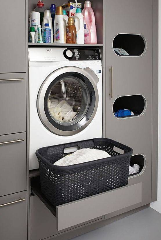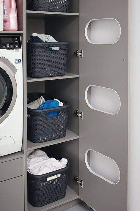 像这种整体式的洗衣柜设计,实用性就比较高了。右侧的柜子中留下一些洞,也是有实际上的作用。我们完全可以将这些洞当成脏衣篮来使用,留几个,脏衣服也就能依次分类,至于怎么分,根据你的习惯来就可以了。洗衣柜留下一些洞,这效果还是蛮赞的。