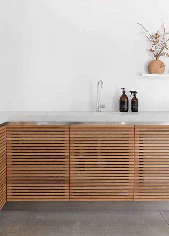 水槽下若也要做成收纳空间,那更得注意通风了,水槽下的湿气比较重,放置东西容易发霉,安装柜门的时候,可以选用这种木栅栏,通风效果还是不错的。