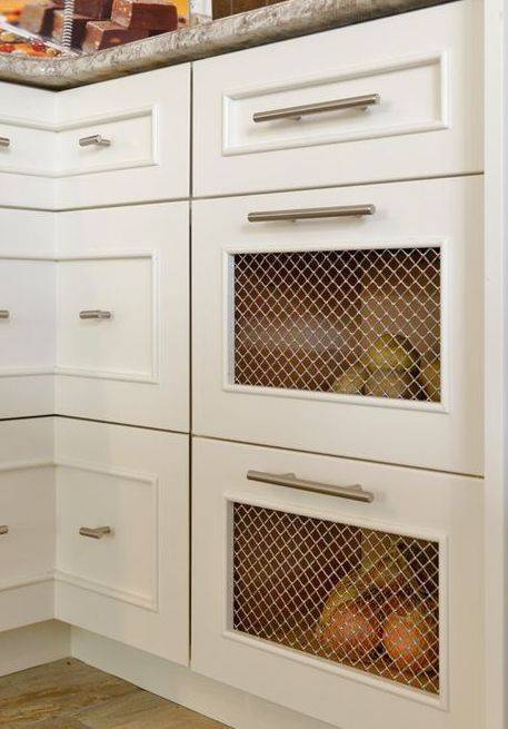 地柜并不是只有用来存放一些锅具的,有时候一些不适合冷藏的瓜果也会单独放置到地柜当中。这时候,柜门上留有一些洞洞,可以更好通风换气,瓜果也能更好的存放。当然除了可以在柜门打洞洞之外,也可以学着下图这样的做法↓