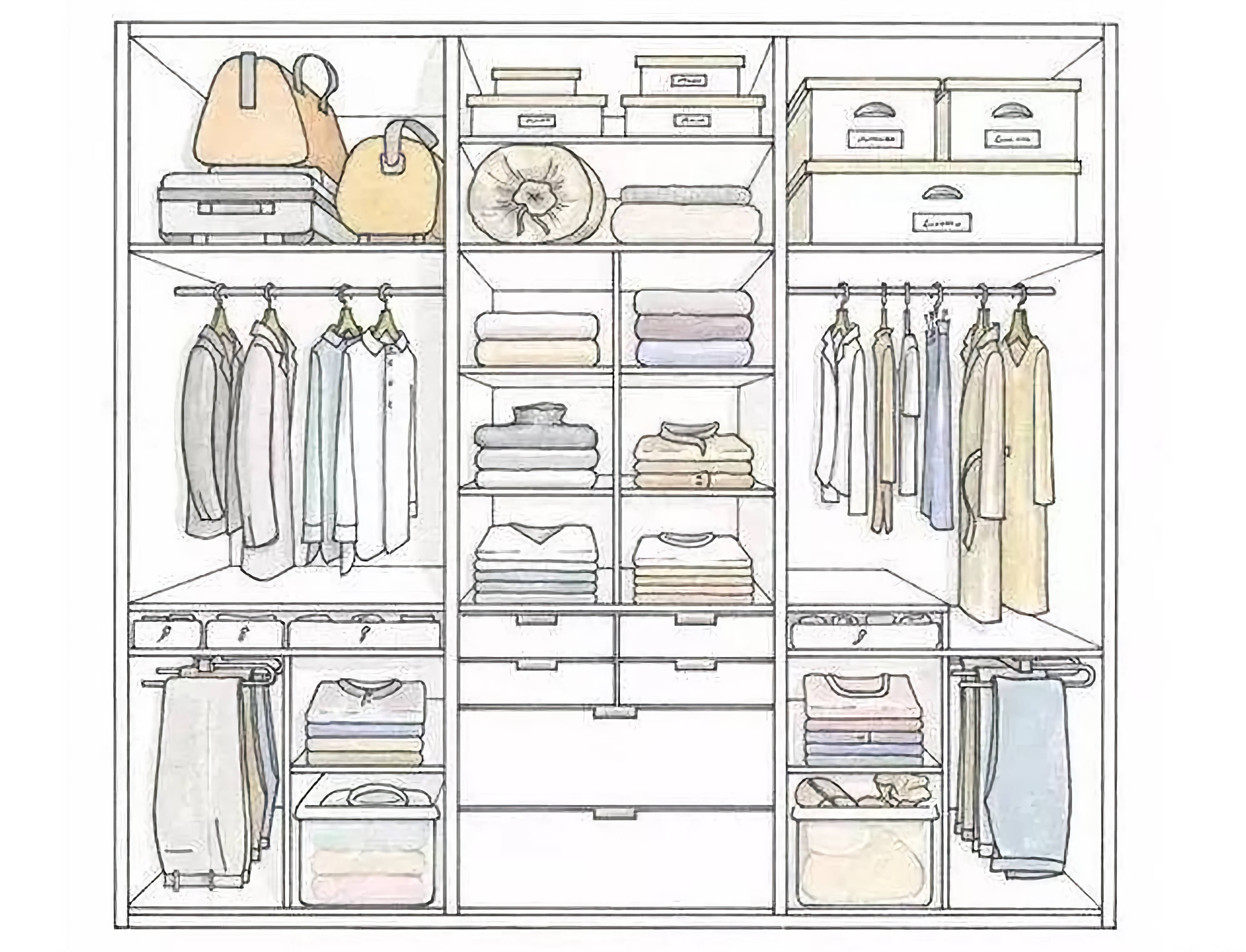 此外就是衣柜的分类规划,可以按照季节常用性规划,另外需要结合家庭主人的穿衣习惯规划,比如喜欢穿长衣、长裙的业主,就需要规划出更多长衣挂置空间。