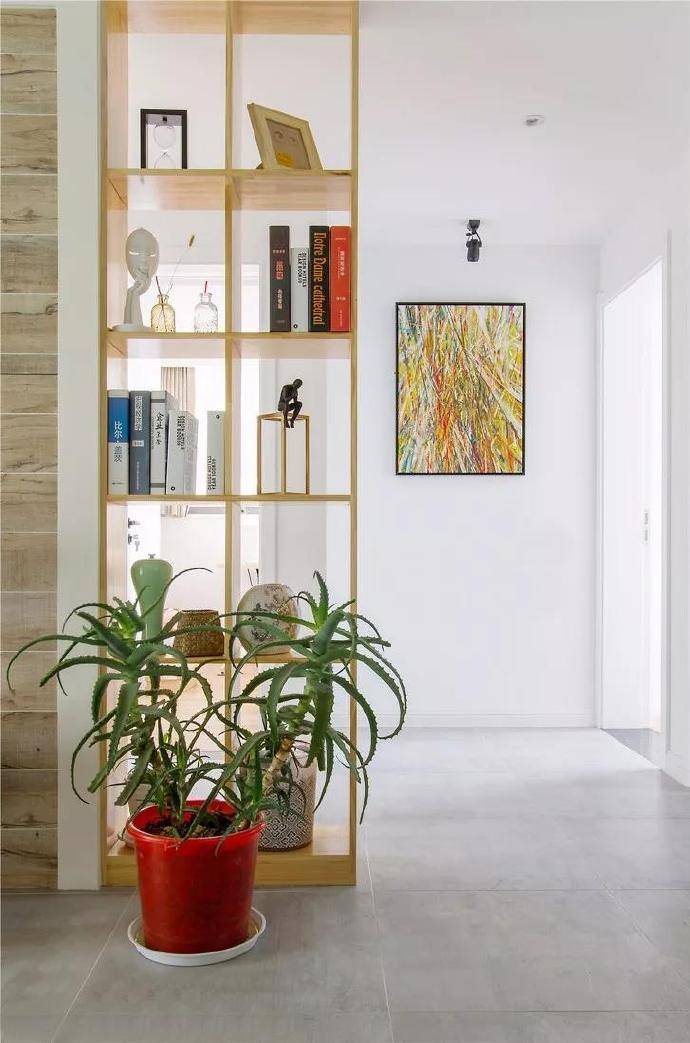 利用置物架做隔断,既可以摆放书籍,还可以放置一些工艺品和相框,起到了展示的作用,地上再放一盆绿植,空间就显得更加美观了。