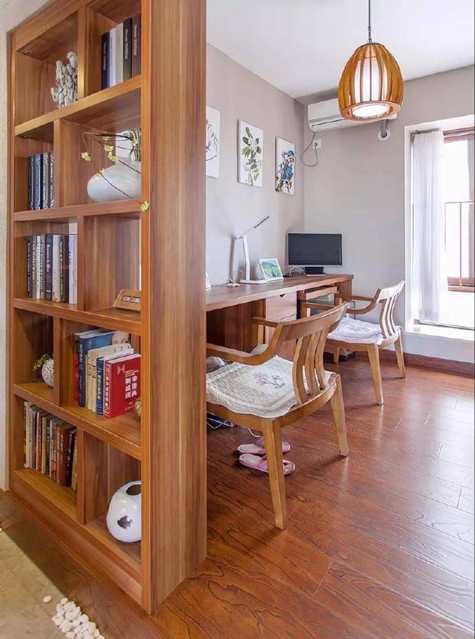 用书架作为居室隔断,可以划分出一间独立的小书房,区域划分的很明确。