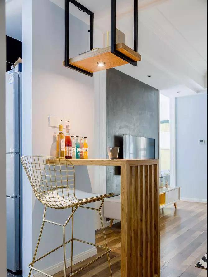 在厨房与客厅之间设一个吧台作为隔断,可以当做餐桌用,或是和朋友在上面喝喝下午茶、聊聊天,作为休闲区使用,心情能得到放松,也更有情调,吧台隔断兼具了装饰和实用性,小户型尤其适合这样设计。