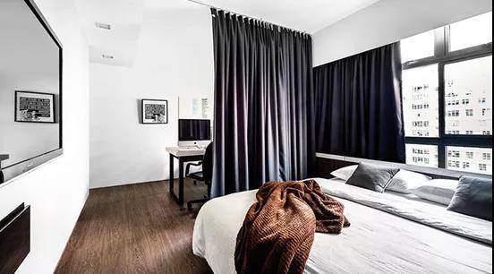 布帘应该是最节省空间和成本的一种隔断方式,休息和公共空间随意切换,灵活性强,大家可以按自己家装风格或喜好来选择颜色和图案哦。
