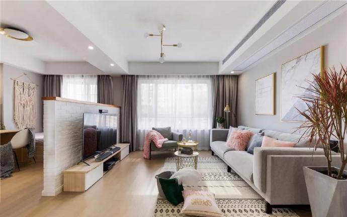 用半堵矮墙作为电视墙隔断,节约空间,轻便灵活,丝毫不影响室内采光,反而给人眼前一亮的感觉,创意满满。