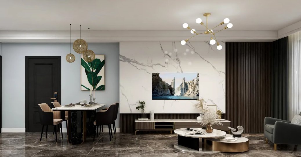 大理石+木材的背景墙,线条利落,造型简单。不仅能起到装饰的作用,还能提升空间层次感。