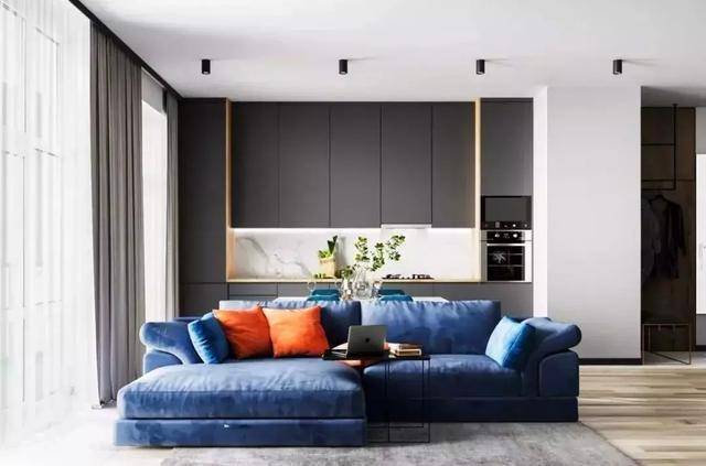 客餐厨一体化,视野更加宽敞明亮,整个客厅的动线、视线重心都被解放了,客厅可以放上从不同地方挑选而来的沙发、单人椅,或者铺上一张地毯围合式席地而坐,小空间也能拥有大平层的既视感。