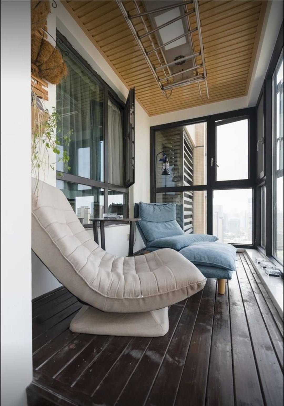 客厅连接的阳台,摆放两把休闲躺椅,这里的视线非常通透,环境也很静谧。