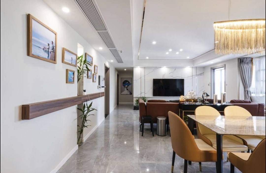 玄关的左手边是个超级宽敞的大开间,视野开阔,通透性和宽敞度,都让人感觉心情瞬间变得非常舒畅,灯光和色彩的搭配也都非常舒适,这样的空间布局和设计,真的进门那一刻就爱了!侧面一条走廊通道,不需要隔断,利用局部吊顶增加区域感,虽然全屋没有任何隔断,但是区域的独立性还蛮强的!