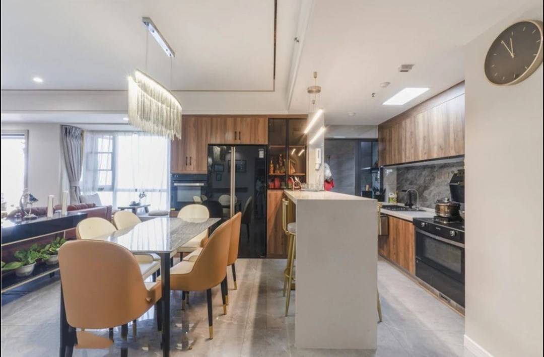 餐厨一体的空间,大量采用内嵌式电器的设计,减少厨房的凌乱感,水晶吊灯和金属元素增加用餐区的浪漫氛围。