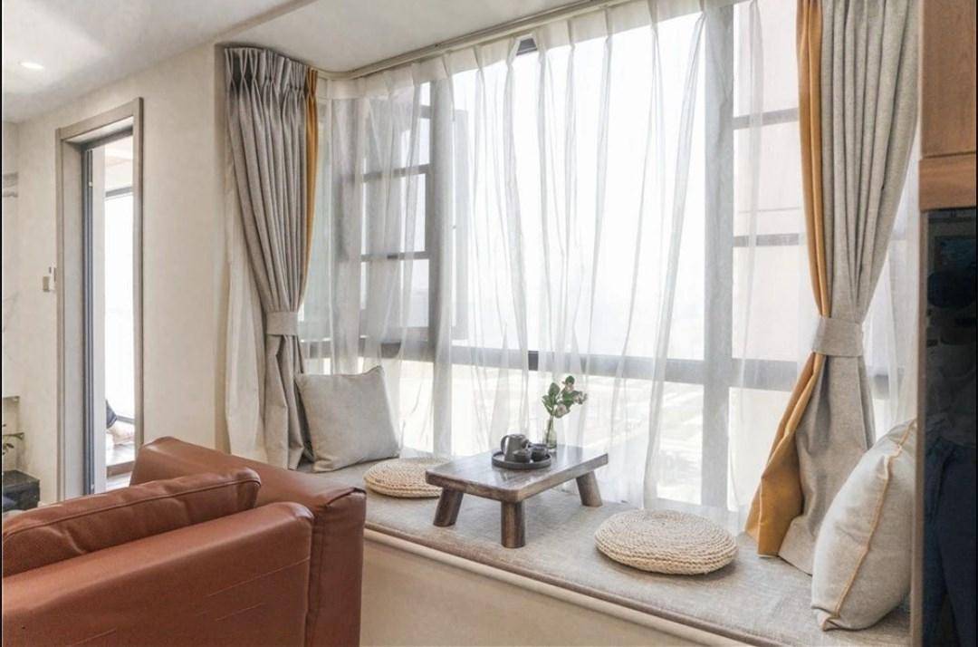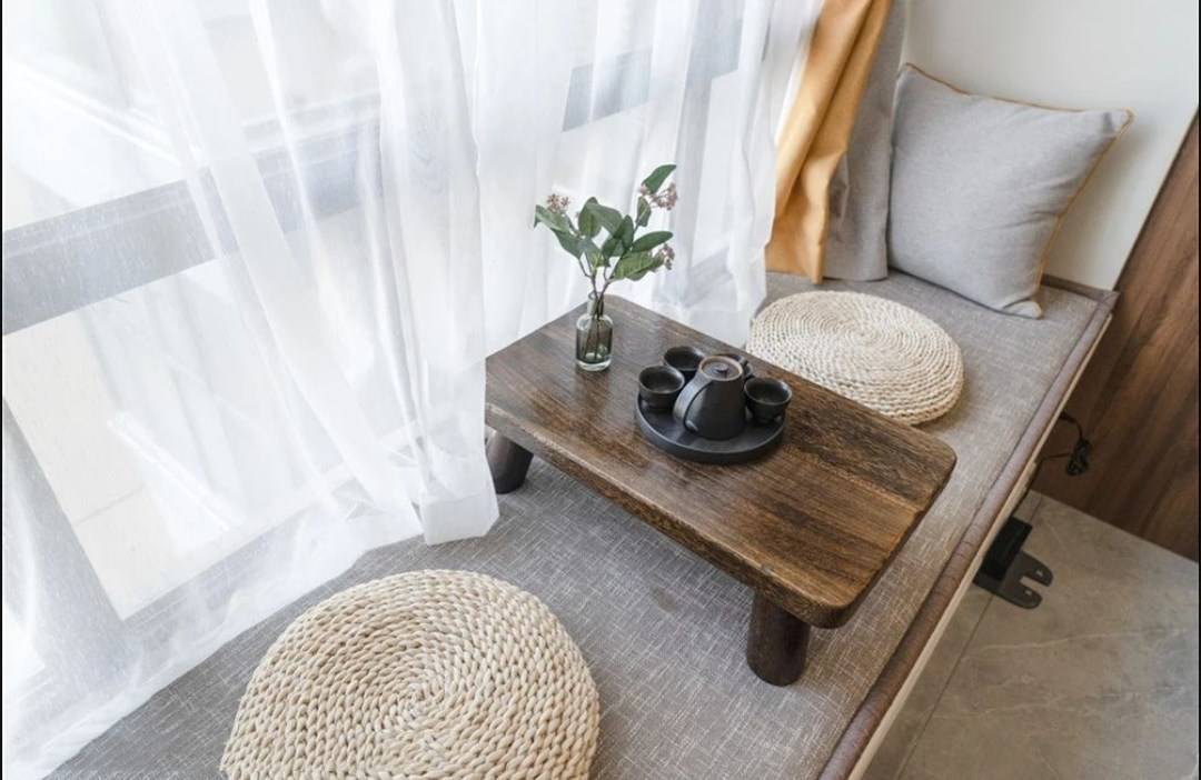 靠窗打造飘窗,中间一个小几,两个蒲团,泡一壶暖茶,桌前对坐两人。休闲惬意、淡雅舒缓的韵律在这个小小的休闲区缓缓萦绕。