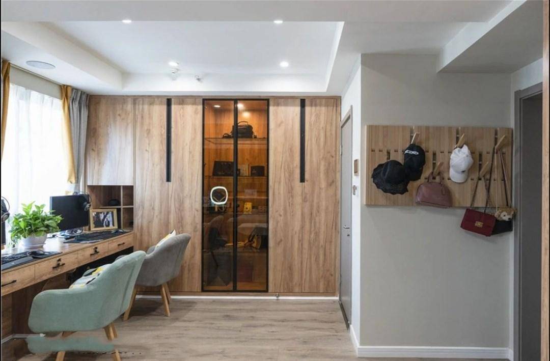 卧室的设计就更厉害了,一个房间四个功能区,首先卧室进门的右手边就有一个简易的挂衣区,进户门对着的是办公区,旁边是衣帽间,办公区对着的是主卧的卫生间!这配套设施,哪里还是单纯的卧室了?这简直就是一个小套房啊!