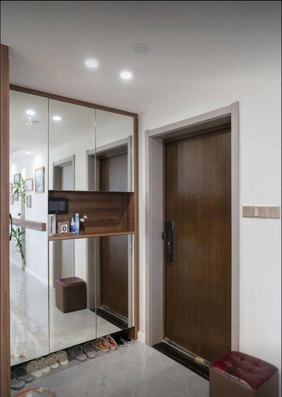 进门的玄关区右手边是一个到顶的镜面柜,既是收纳柜还是穿衣镜,底部悬空用来收纳室内鞋。中间留出一部分设计成壁龛收纳格,整个玄关柜简约大方,还能增加空间的延伸感
