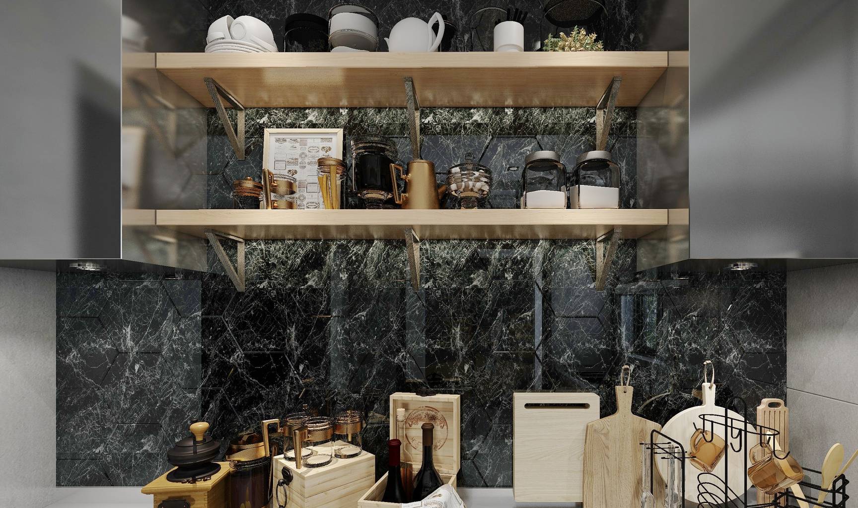 如今的年轻人,不少都舍弃了传统的吊柜设计,而选择了更加新颖时尚,并且使用方便的置物架。
