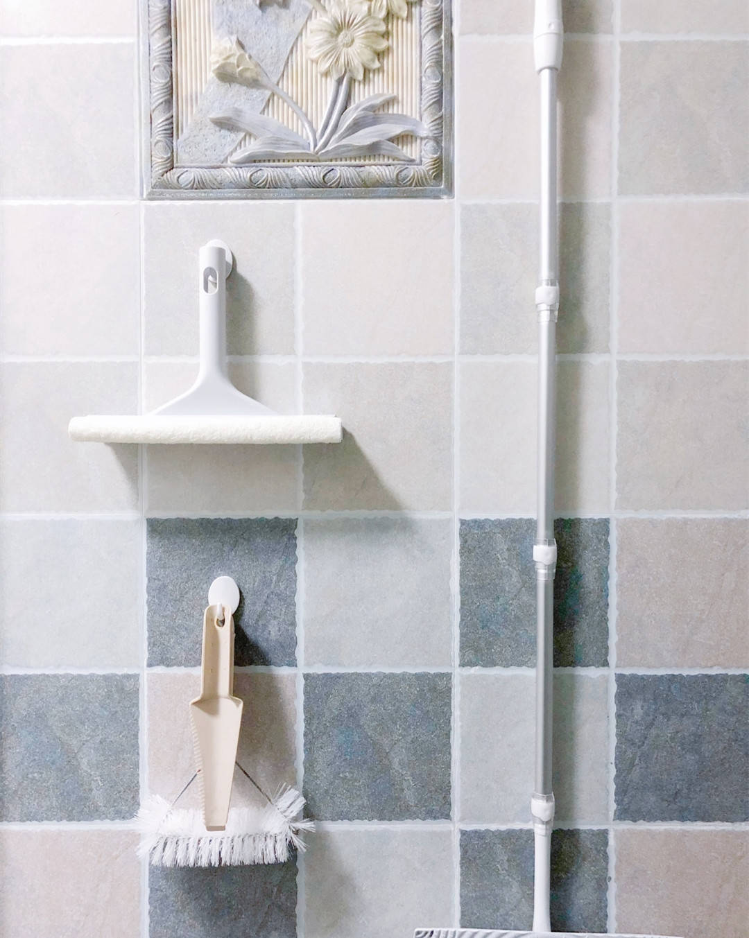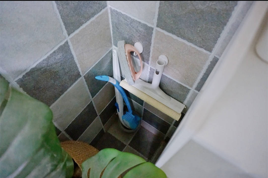 第三个地方,就是卫生间。有些清洁工具经常会在卫生间用到。比如擦玻璃器,和刷子之类的。利用挂钩挂在卫生间角落的墙壁上。平时碰不到,用时拿取也超方便!