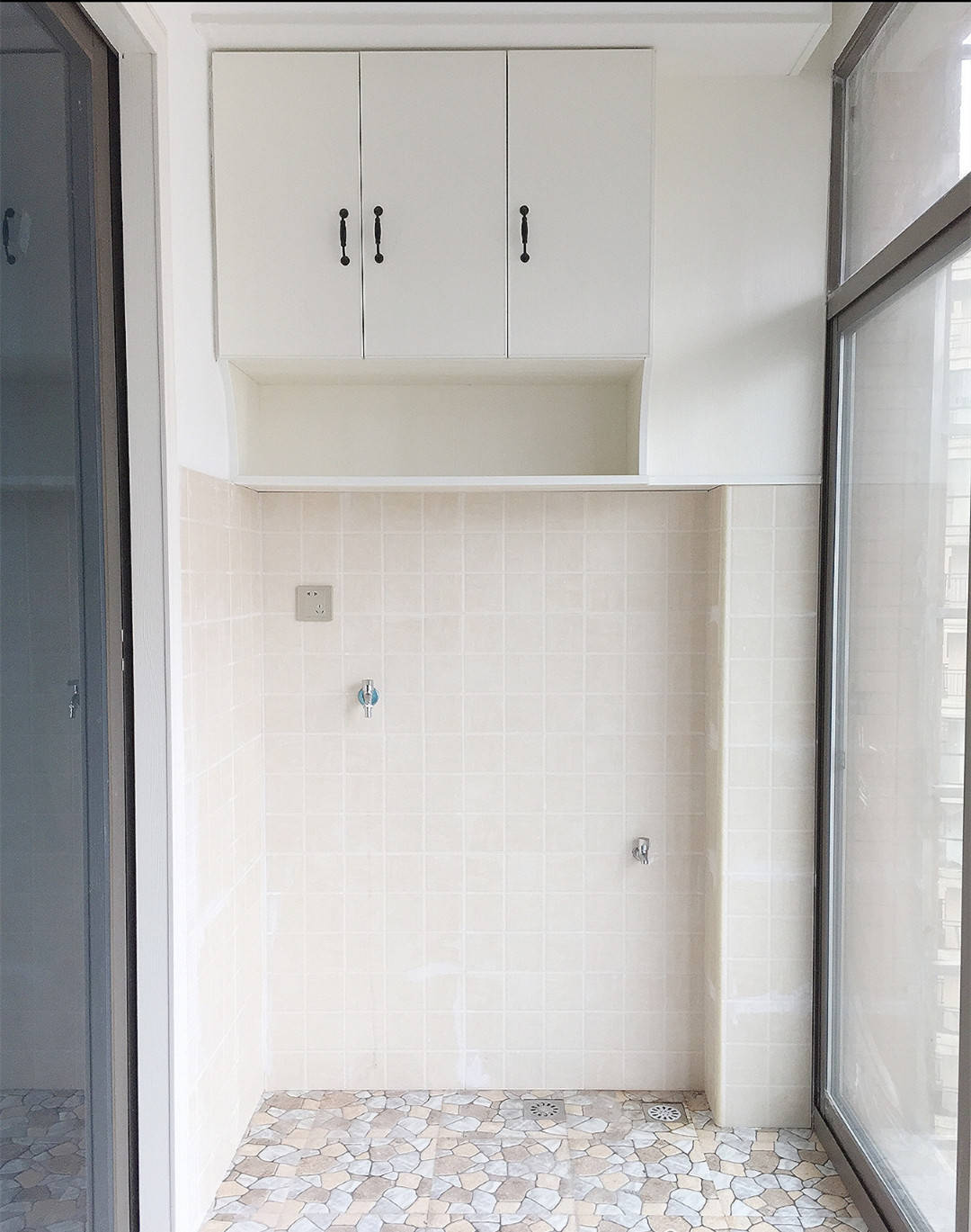 第二个地方,就是我家的阳台,阳台设计成洗衣房,上面打了柜子,好在柜子的收纳空间比较多,所以另一部分的杂物就可以塞到这里来。