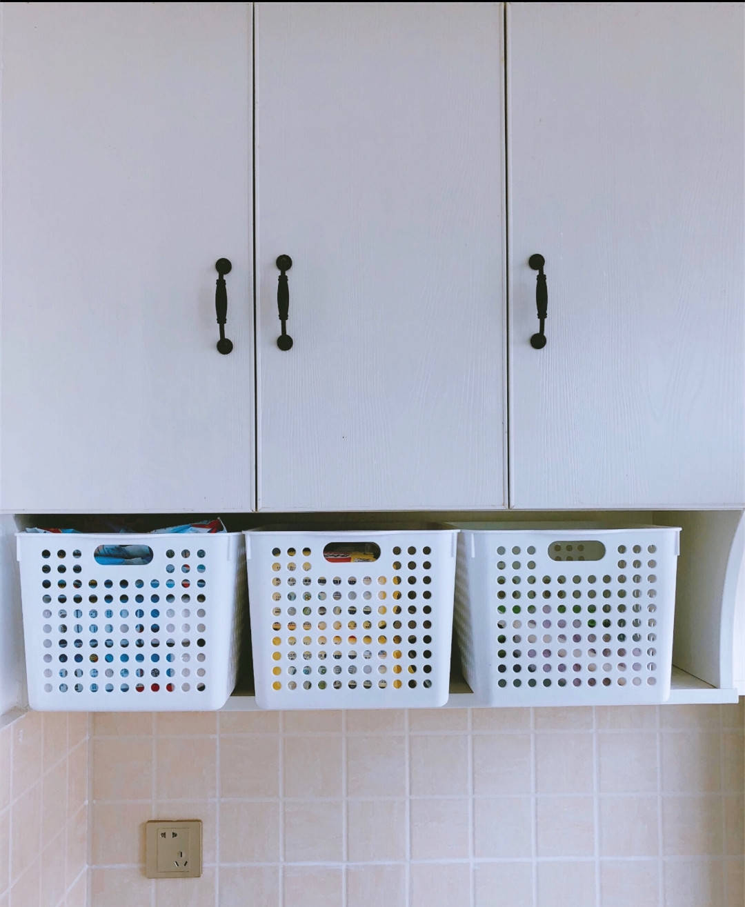 这个地方的收纳方式,我是利用了各种收纳筐进行收纳的,因为洗衣房经常会用水,所以露在外面的收纳空间就用塑料筐收纳。主要是各种洗涤用品,洗衣液、柔顺剂和除尘的清洁剂等等!