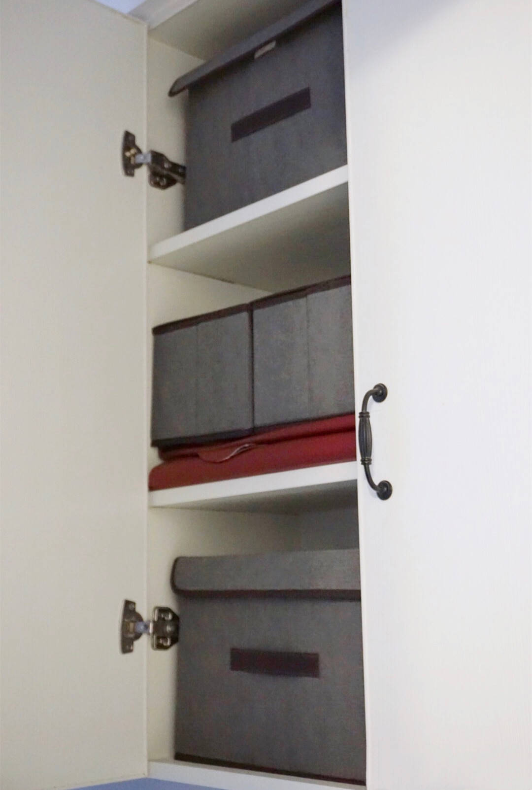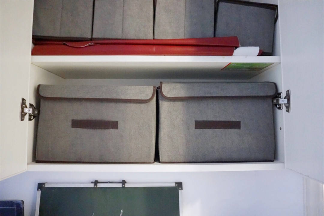 柜子里面用可以折叠的布艺收纳筐进行收纳,一来布艺收纳筐也可以清洗,二来它还能折叠,不需要用的时候叠起来也不占地方。并且不是透明的,很多杂物放在里面,外观上看一点都不凌乱。