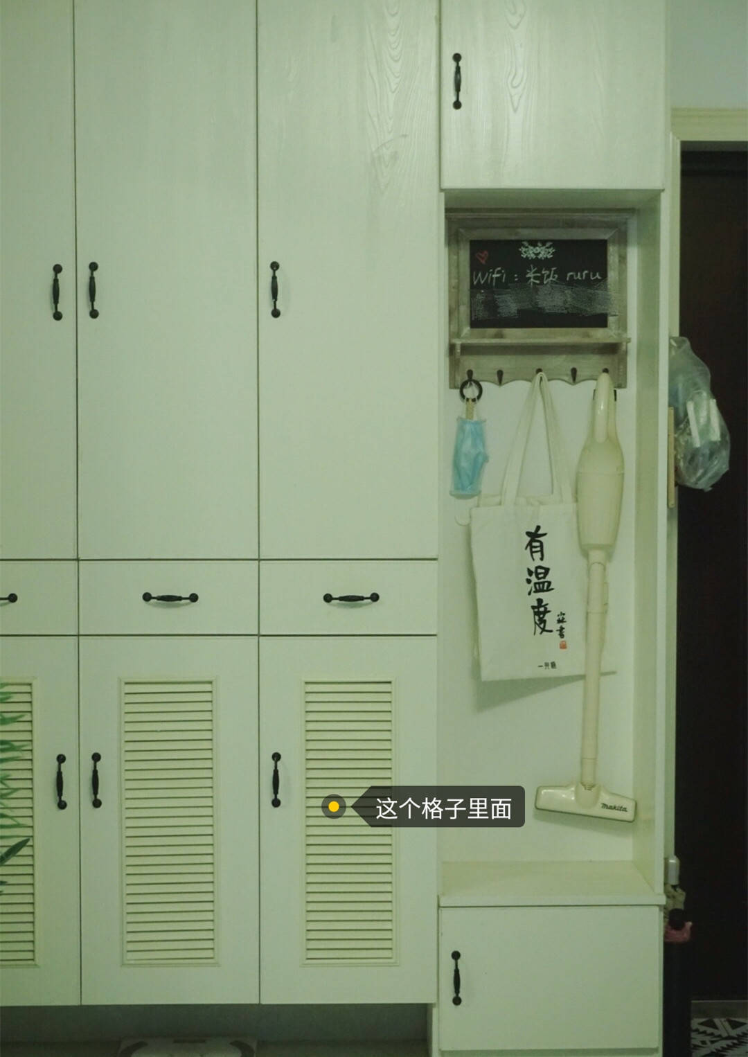 相信很多家庭都和我家一样吧,这些虽然可以挂起来,但是挂起来又很乱的东西着实让人头疼,塞到夹缝中,又觉得丑的不行。如果你家也没有杂物间或者杂物柜,那就倒腾出一个小格子,利用柜门遮挡住丑乱吧!