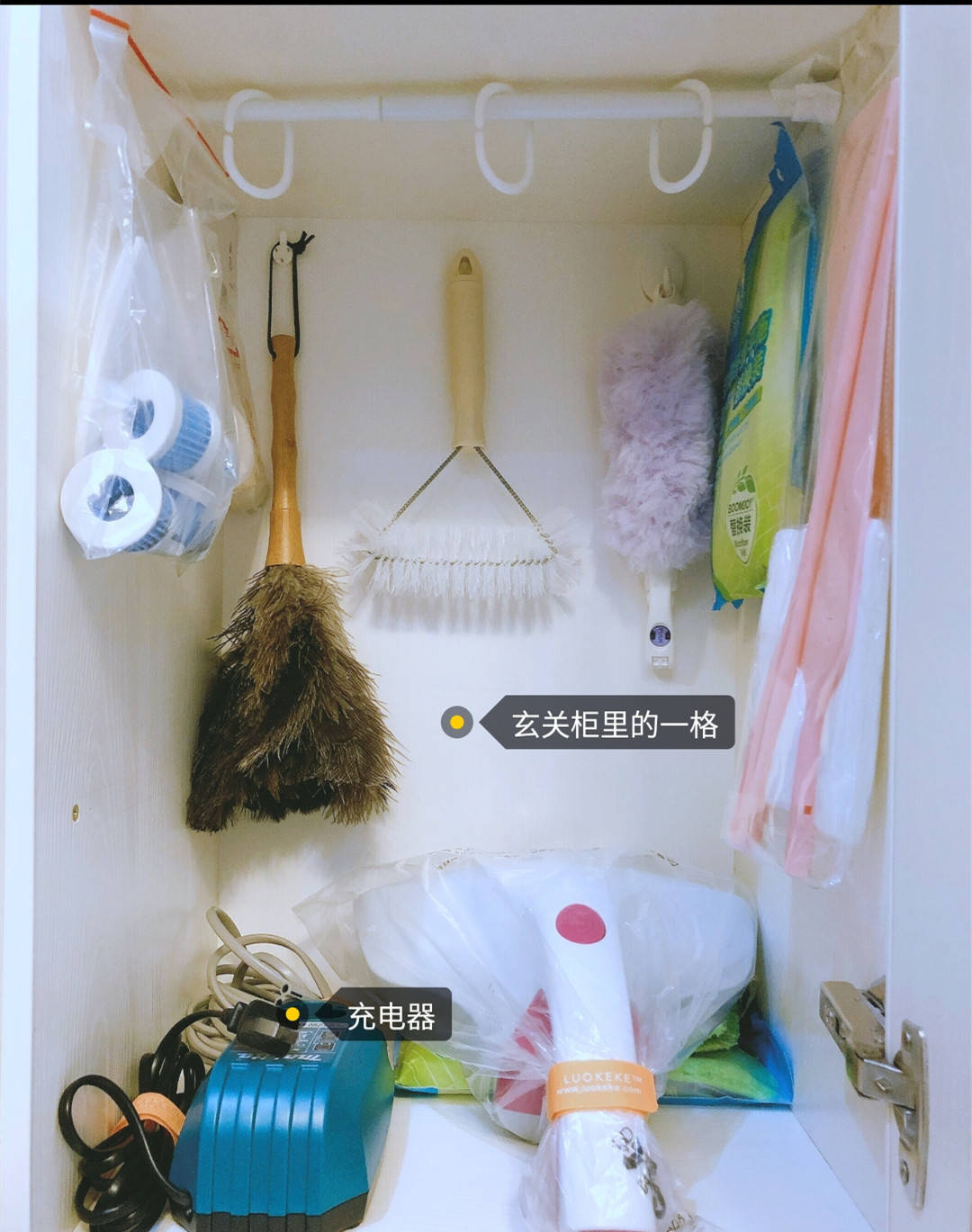 第一个位置就是我家的玄关柜,玄关柜下方单独整理出一个小格子,然后在里面安装上可以伸缩的挂杆,这样就可以将一些不规则的清洁工具,都收纳在这里。
