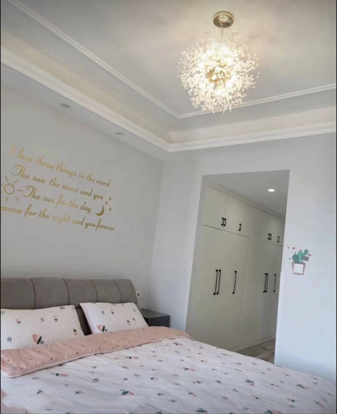 卧室的大衣柜非常强悍,原本进门就是一个长走廊,门对着床头不说,空间还很浪费,装修时设计师将这里设计了一面到顶的走廊大衣柜。收纳力超强。
