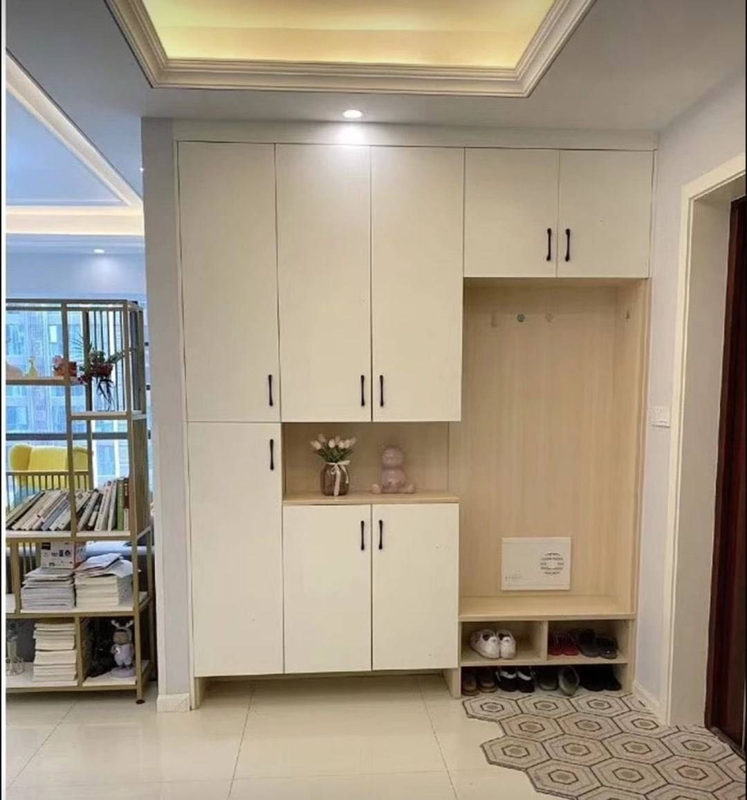 我家进门的地方有独立玄关收纳空间,装修的时候打了一组到顶的多功能玄关收纳柜。有换鞋凳还有鞋柜和简单的挂放区。朋友来了都说我家的玄关柜设计的好。实际上我家进门处不仅有一个玄关柜,另一侧墙面还有一个餐边柜。多亏了我家设计师当初一直劝我装,不然少个收纳空间,就太亏了!