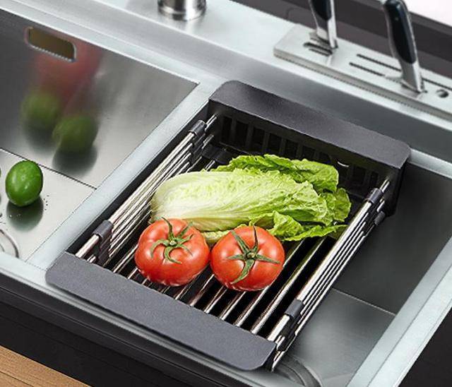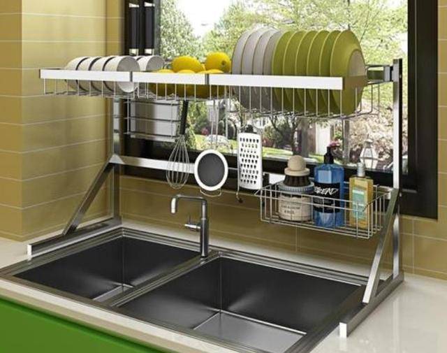 我家厨房曾经在水槽上方摆了一个类似图片这样的不锈钢沥水架,当时觉得很实用,既能沥水,又能挂很多东西。但是,后来决定把它撤掉,觉得太占地方了,厨房台面看起来不够清爽,容易积灰积水垢,不好清洗。