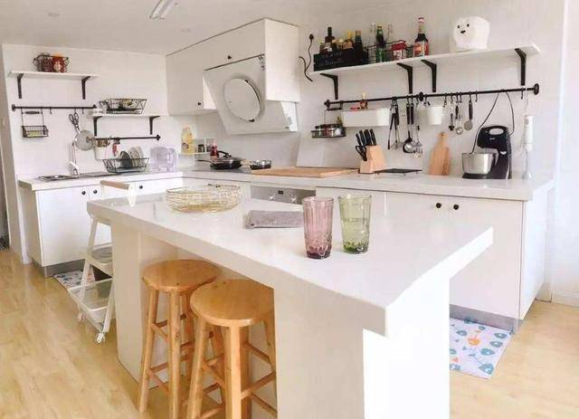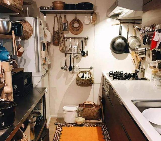 不要以为厨房里的东西挂起来就会显得整洁,除非是相同的材质和颜色,按照长短、大小、高矮排列悬挂起来才会显得整齐,否则厨房看起来更乱。