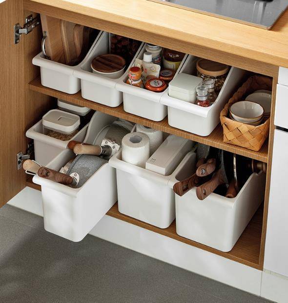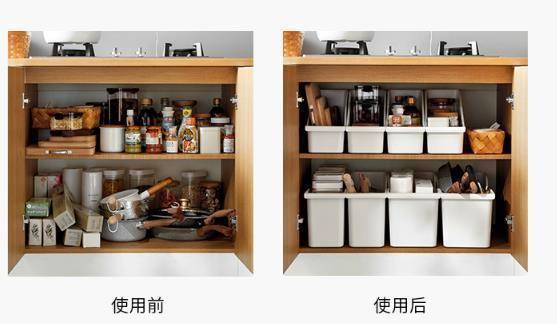 厨房很多东西可以用统一的收纳盒装起来,放进橱柜里面,像平底锅、锅盖、砧板、调料这些都能收纳得整整齐齐。