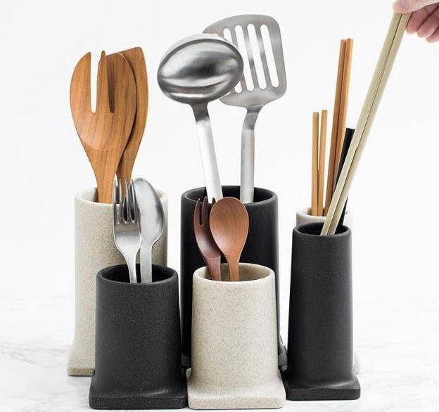 筷子、勺子、刀叉、锅铲这些东西,洗干净后擦干水分,一起放进一个筷子筒里面,想要通风透气可以选择带孔的。
