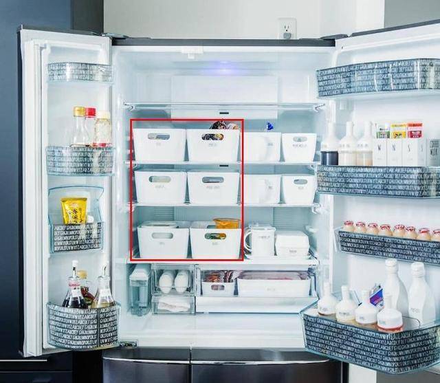 我家是简单的三门冰箱,保鲜层有三块隔板和一个抽屉,隔板上就放了6个图片中圈出来的收纳盒,买的是大号的,刚好合适。