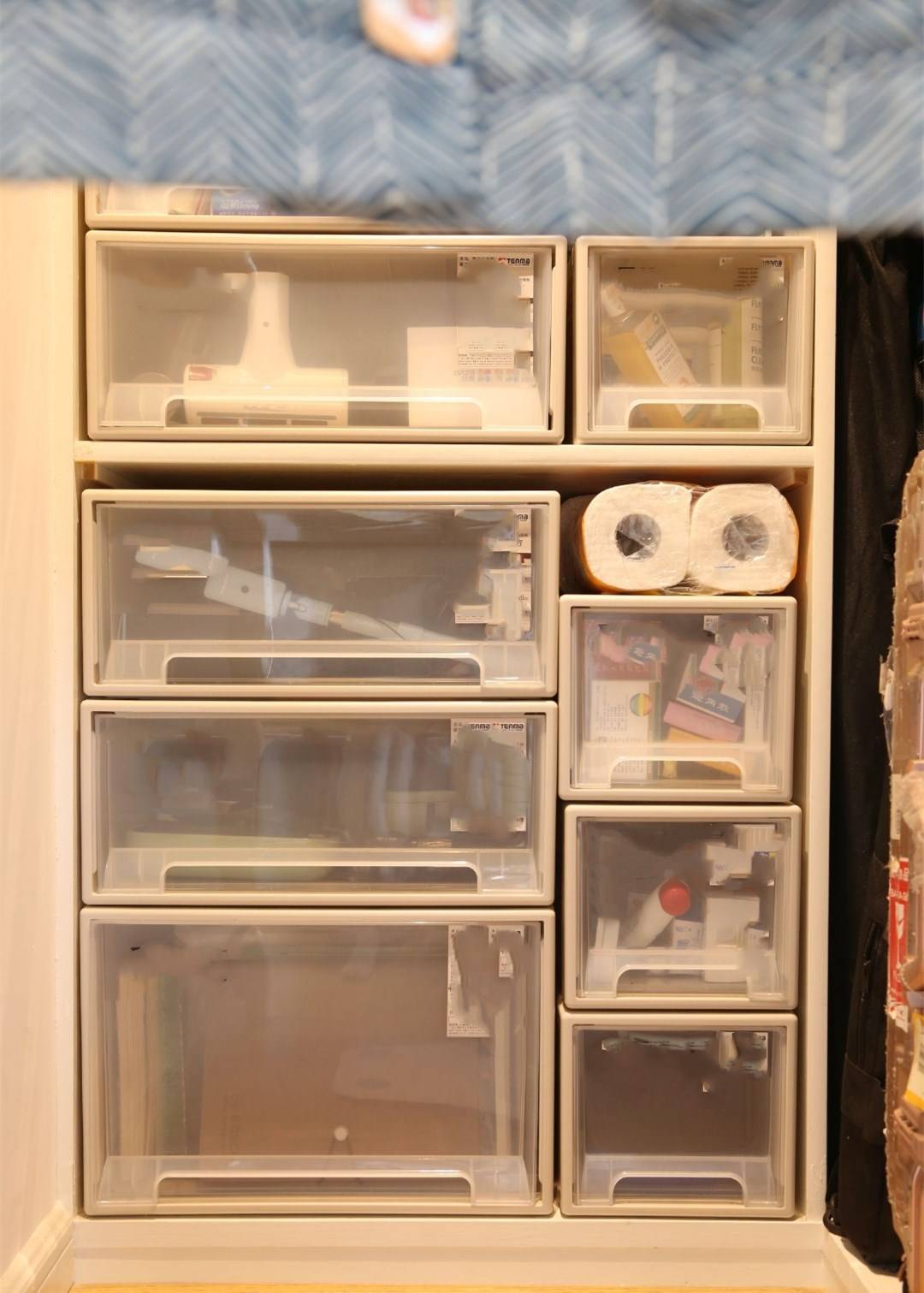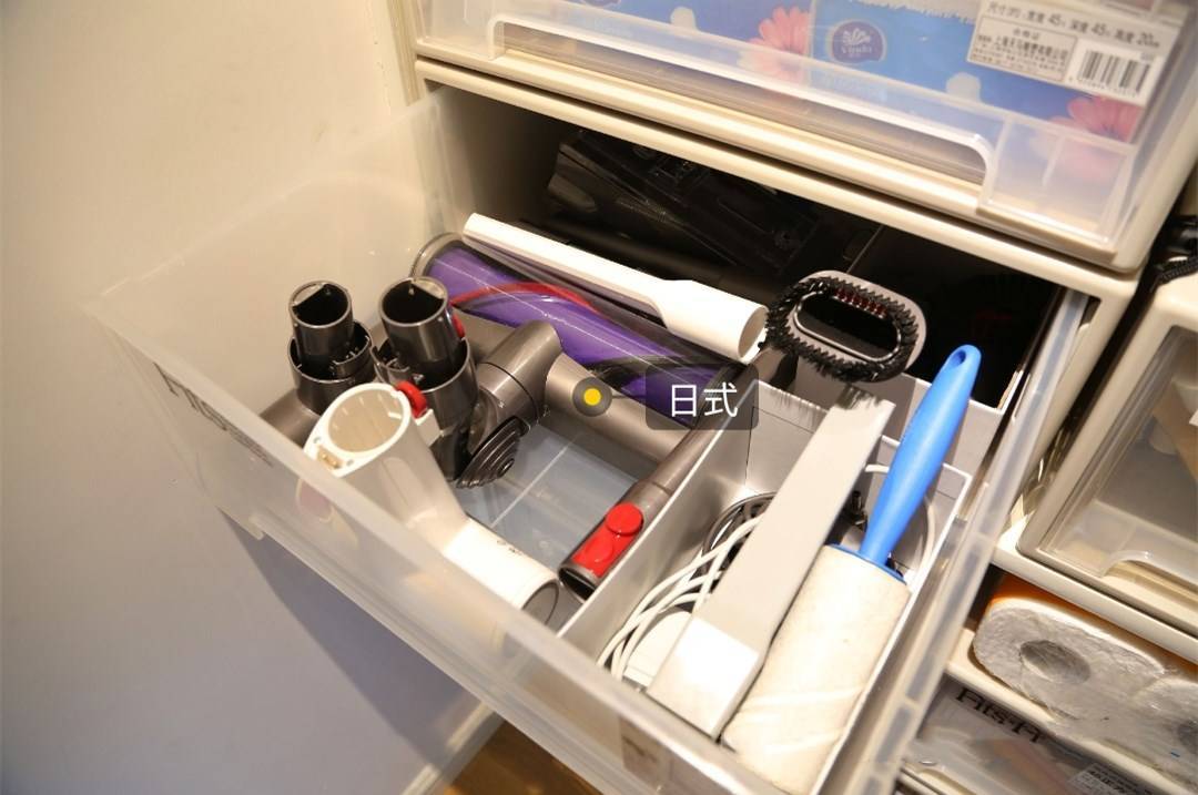 特别是这个组合的收纳箱,封闭的收纳箱外侧是透明的塑料,可以看到箱子里装的物品是什么,外侧还贴了标签,方便寻找物品。药箱、清洁箱、以及工具箱都在这里!