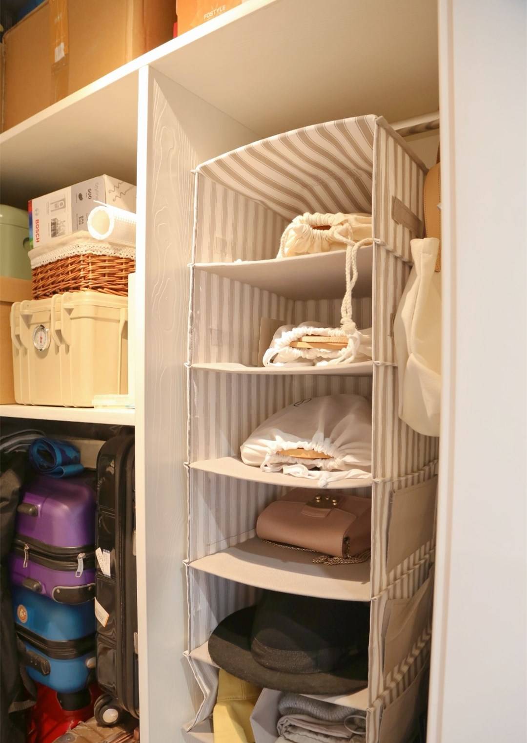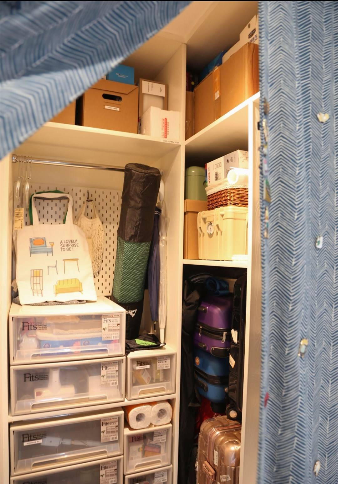 利用布艺的收纳筐,收纳我的包包和帽子。我和老公都比较喜欢旅行,所以家里的旅行箱也比较多,但是这个杂物间里都能装得下!还有一些户外用具。