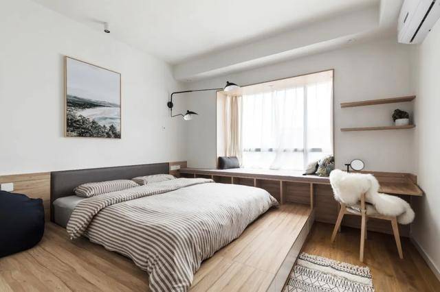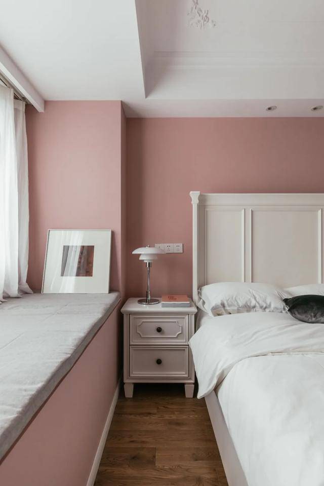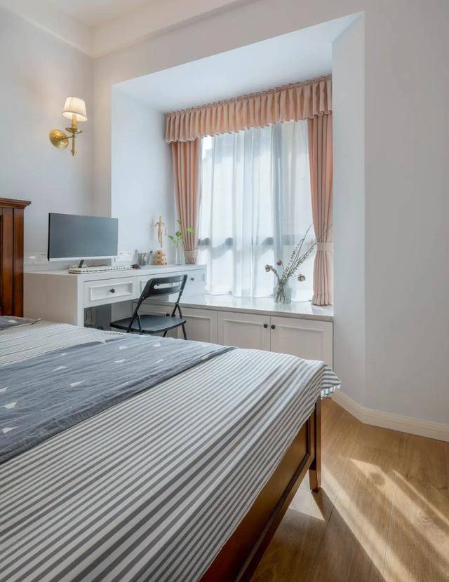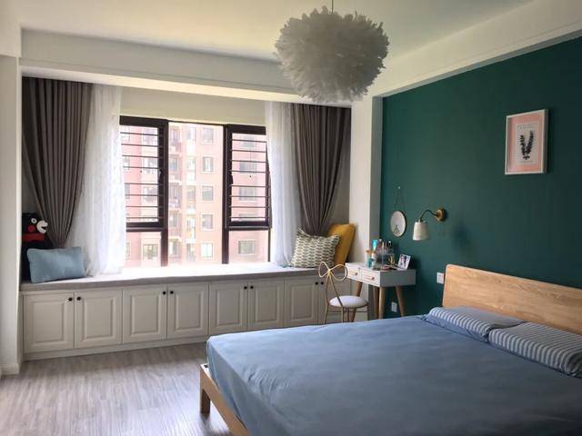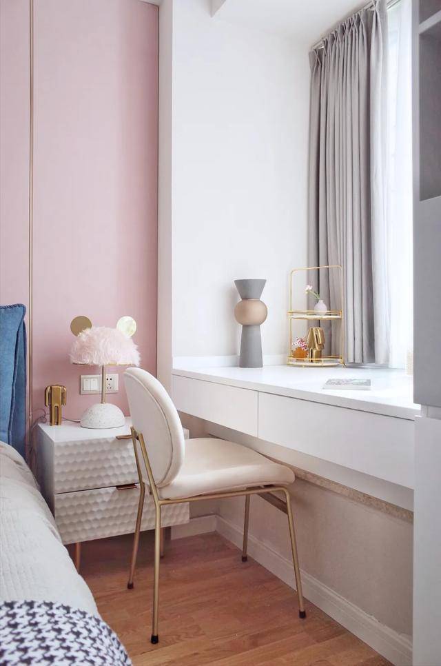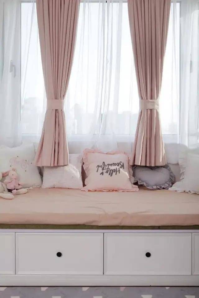 如果飘窗的空间不是很大的话,可以当做梳妆台。这个飘窗的设计,粉色的墙壁和奶白色椅子的搭配很少女,很温馨治愈。在飘窗上加了一层抽屉,飘窗变高了,可以当做是梳妆台,化妆的时候采光效果也很好,坐在这里化妆美美的,开启新的一天。