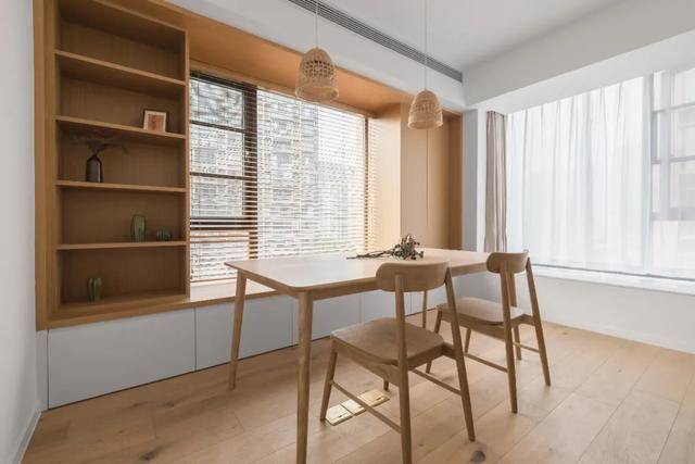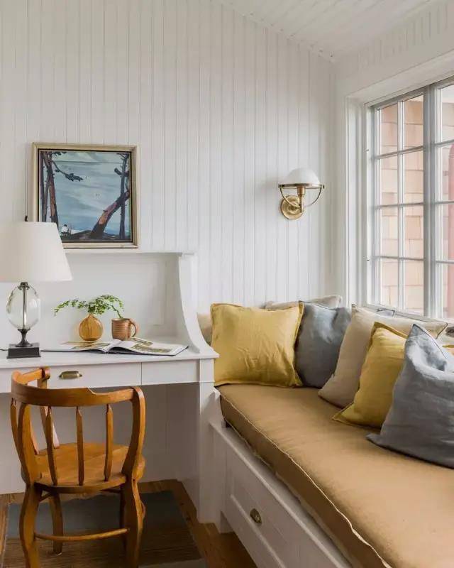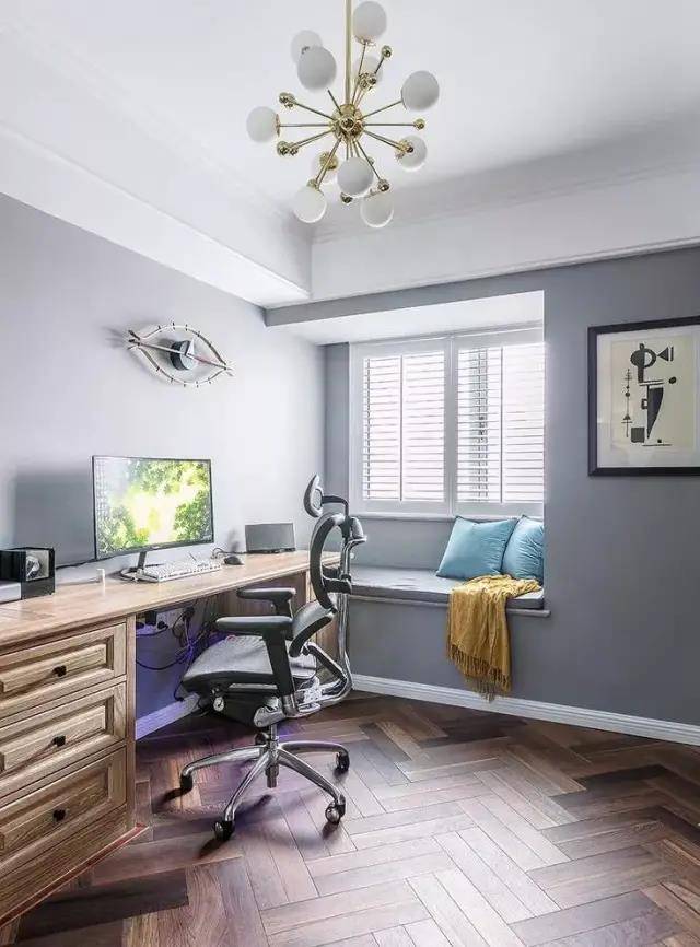 除了可以改成收纳的柜子,还可以让飘窗和书桌结合,成为读书角。这个特别适合小户型参考,因为有的家庭的空间可能有限,这个时候可以考虑把飘窗改造成简单的“书房”。在这里看书,不仅采光效果很好,而且学习累了还可以极目远眺。