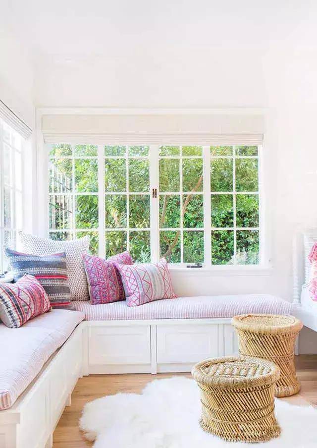 简单来说,L形飘窗是两块玻璃拼成的空间,相比较于普通的飘窗设计,L型的飘窗视野更加开阔,空间更大,采光相对也比较好,给空间增加了采光效果。可以把L型的飘窗设计成图上这样子,还有着舒适自然的坐席位置。